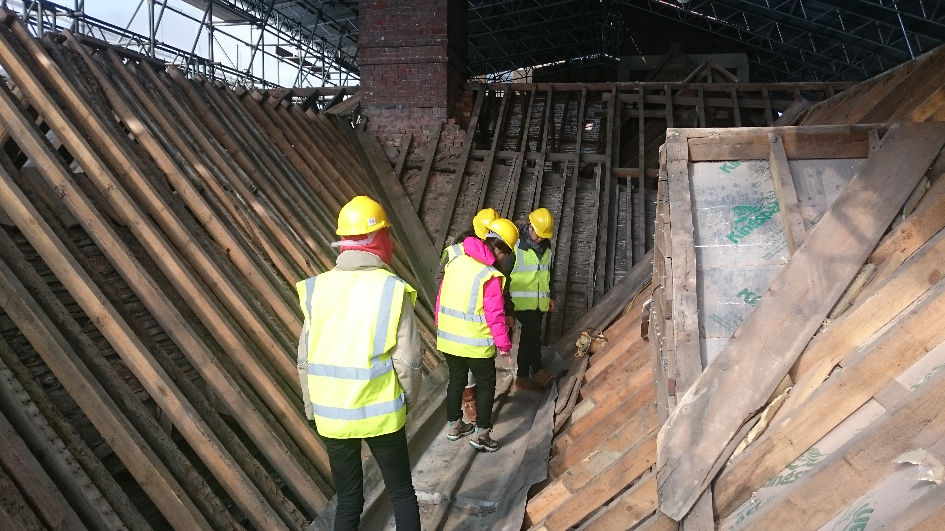 The site is a live construction site and so the visit began with a health and safety briefing and induction. The students were then introduced to the history of the site and to the present scope of works before being given tours of the site by Mark Lidster of Corbel Conservation (corbelconservation.co.uk), Ann Manders of the Somerset Buildings Preservation Trust and ourselves.