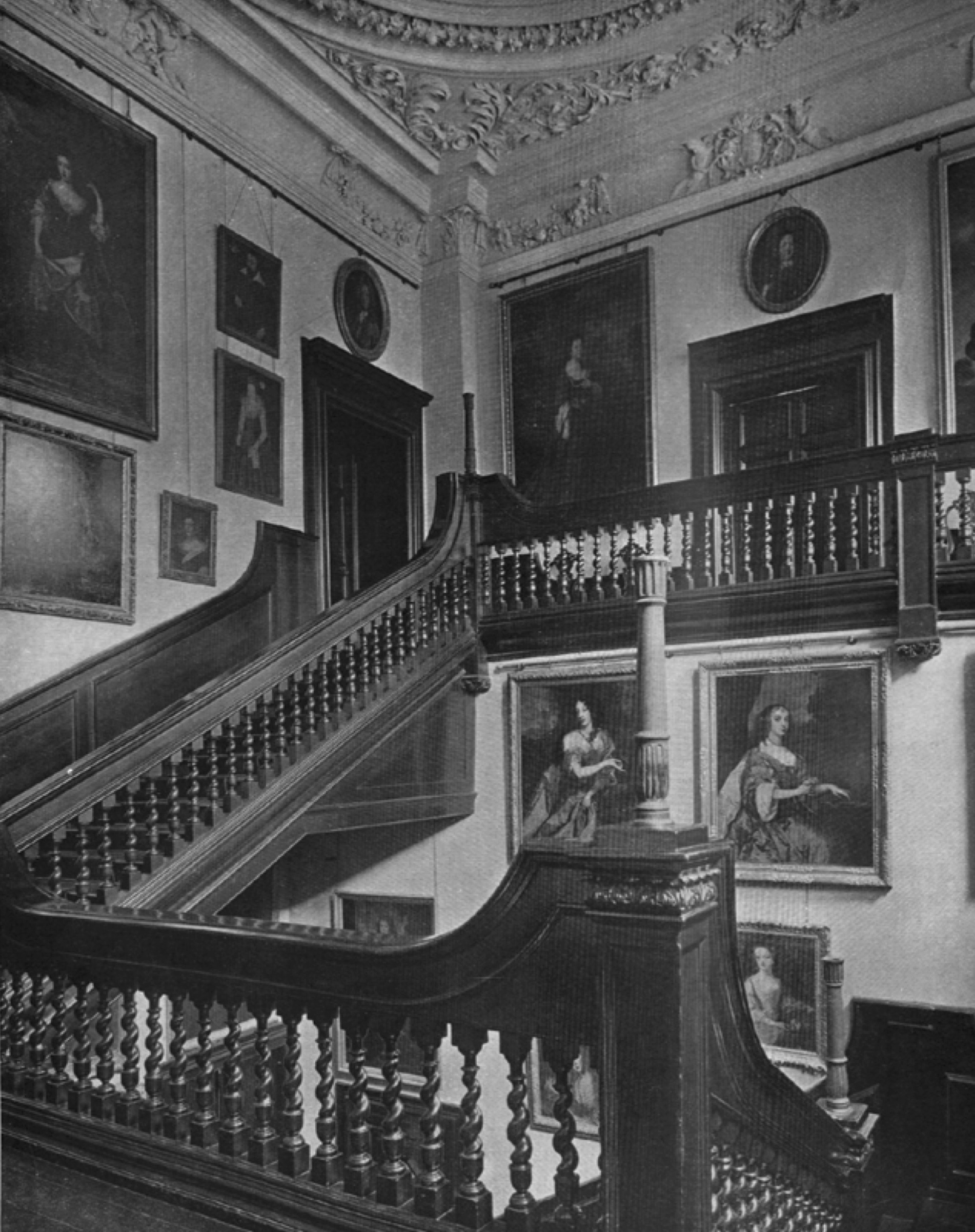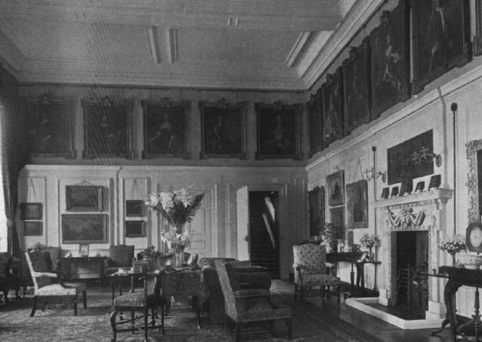 The Saloon at Halswell has a large open frieze above the wall panelling in which used to hang 21 family portraits, this collection of pictures still exists in full at Southside, though dispersed throughout the house itself.