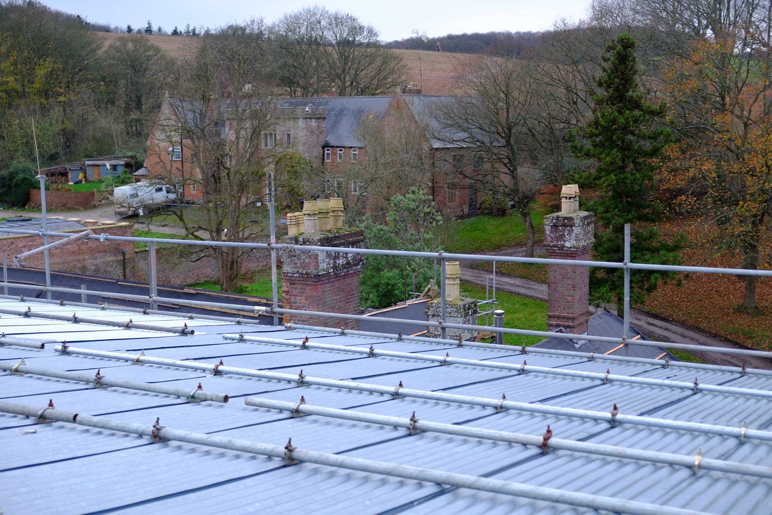 The chimney stacks at Halswell consist of two distinct groups; those hidden within the formal architecture of the Baroque north wing, and those that survived from the Tudor manor with its later additions in the 1590’s and beyond. During the nineteenth century and the 1920s all of the chimneys were rebuilt above the roofline, either using big new redbrick stacks typical of a robust Victorian roofline, or hidden completely within the parapet of the seventeenth-century Baroque wing. As enticing as it seemed for us to remove the Victorian redbrick and attempt to re-create the older mix of chimneys, there were no remaining features to work with, and although the Victorian brick has a different feel, they are honest indicators of the house living through that period, and as such are important historically in their own right. Therefore, in consultation with conservation authorities, the decision was made that the redbrick would be maintained, and the mixture of twentieth century pots that cap them should be removed and replaced with more sympathetic features.
