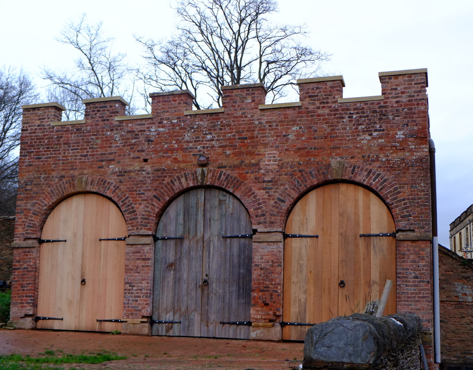 While this woodwork was being carried out the stone and brickwork to the battlements could also be taken down and re-built using the original materials where possible, and new cut masonry where needed. The three keystones in each of the archways had also failed and were in danger of collapsing, taking the building with them. The entire building was re-pointed, and although the earlier doors had all but rotted away, we managed to remake one door out of the usable remains of all three, thereby retaining as much of the original materials as possible. The flanking two doorways were entirely made by the craftsmen at Corbel Conservation in our onsite workshop. We also repositioned the three doors into their original positions, which were underneath the arches and recessed by a few inches. This protects the doors from the elements, rather than leaving them exposed, as they had been since the nineteenth century.
