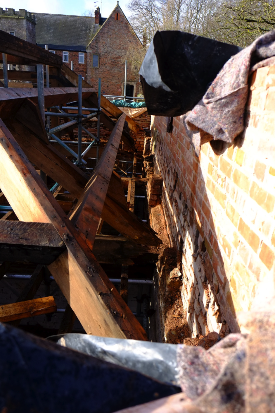 Above that the roof structure had completely rotted away from the walls into which it was originally supported. The lead guttering within the parapets had failed allowing water to pour over the woodwork. In some cases the battlements themselves had fallen over and into the already damaged lead guttering. Luckily the leadwork above guttering level was in fairly good order so the rest of the eighteenth-century timbers could be saved by splicing new end pieces onto each one.