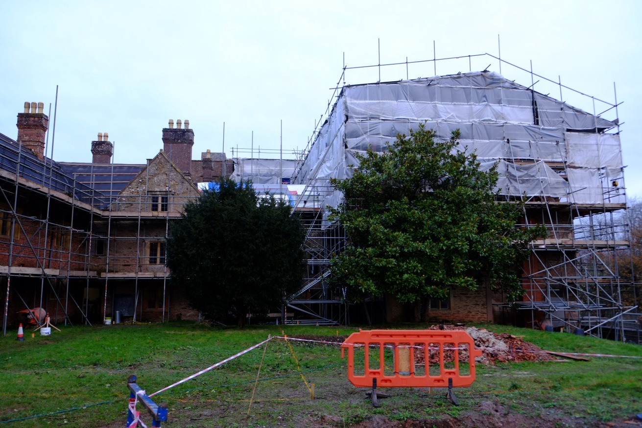 Dear Mick, I’m glad you are following it so closely. The area in blue on the first Victorian photo is the area that the gets the new c. 1900 gable with chimney added. The last Victorian photo from the south east shows the building and its new gable without trees or scaffolding, which might help you get your bearings. The recent photos in between are all the south range with and without trees – but all with scaffolding – including a close-up of the c. 1900 south east gable and chimney. I hope that makes things clearer.