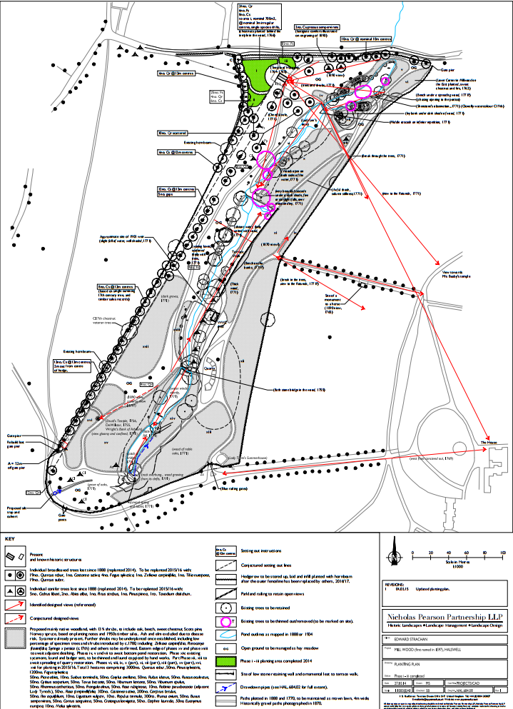 Simon Bonvoisin of the Nicholas Pearson Partnership has undertaken a long and careful study of Mill Wood. By referencing all published and unpublished material relating to the original layout, maps from 1756, 1771 and later Ordnance Survey maps he has been able to confidently re-create the planting in Mill Wood as it was intended in the eighteenth century. As well the tree species known to have existed here through this research, we have been also able to plot out the pathways with their very considered views and vistas. Some closed off and secluded, others open with views to the house or far flung follies like the Rotunda. The eighteenth-century layout of Mill Wood was an ingenious exercise in landscape design, controlling the visitors’ sensations using views, water, planting and follies. The arrangement of the trees was fundamental to the success of each of these distinct wooded areas as one progressed through the walks.