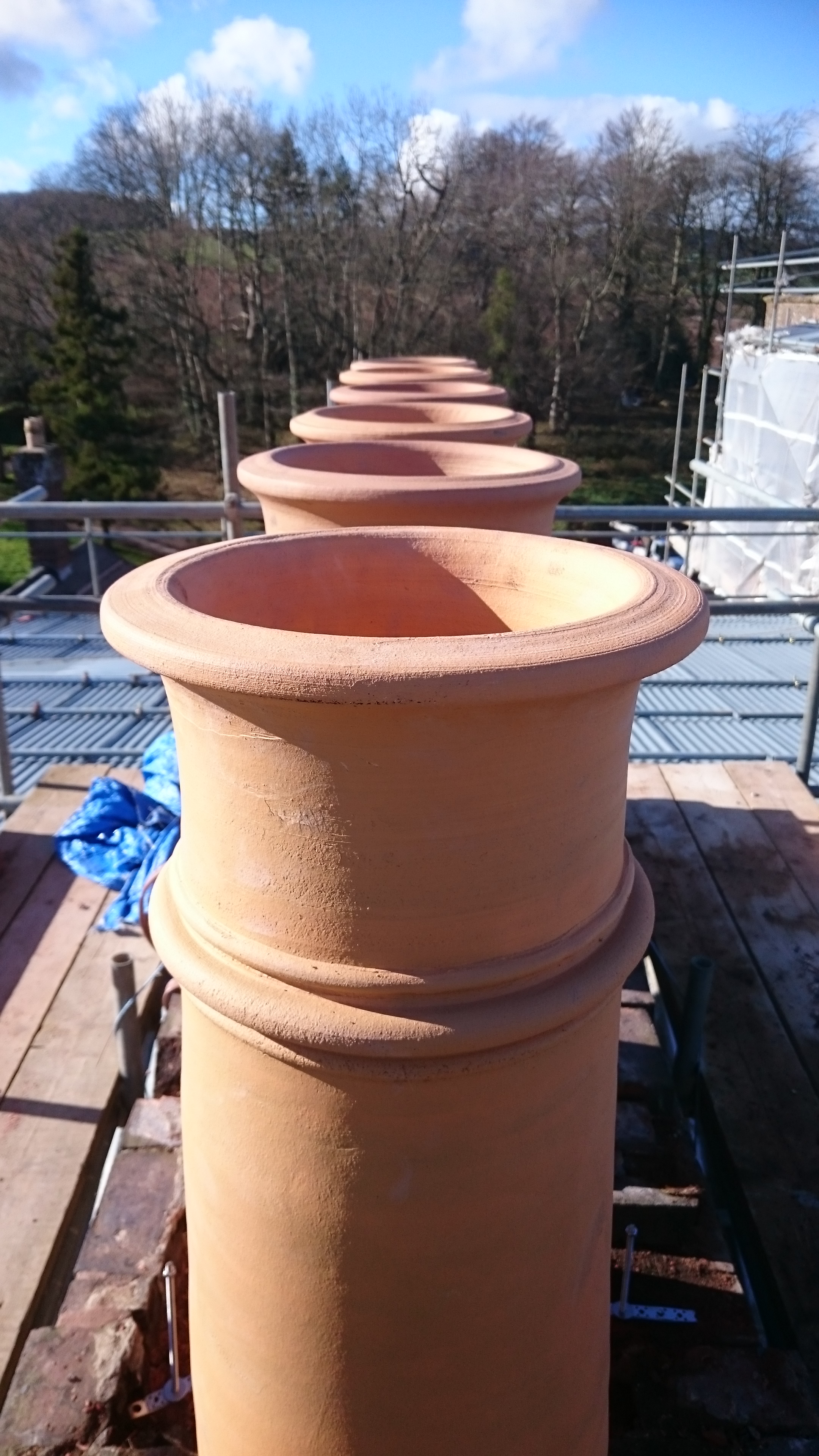 Chimney pot up and chimney stack repairs being carried out, with Robin Hood’s Hut beyond.