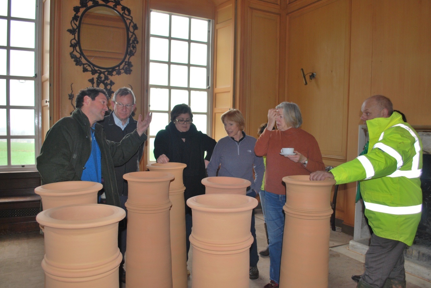 A few days before the chimney pots are put in place they act as useful tables in the Mansion House, with Edward Strachan, Stuart Senior, Claire Fear of Architectural Thread, Helen Senior, Camilla Carter of the Somerset Gardens Trust and Councillor Ian Dyer of Sedgemoor District Council.