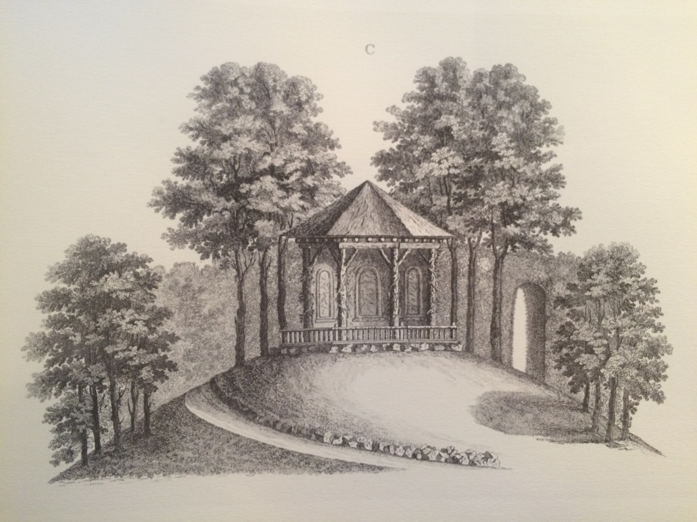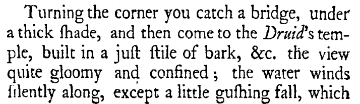 “The water winds away through the grove in a proper manner....Turning the corner you catch a bridge, under a thick shade, and then come to the Druid’s Temple, built, in a just stile, of bark, &c, the view quite gloomy and confined: the water winds silently along, except a little gushing fall, which hurts not the emotions raised by so sequestered a scene.”