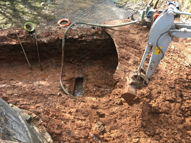 The original pond drainage channel found! The wall section directly above it has been re-built at some point, one of the many historic changes that we have discovered during the first week of exploration works.