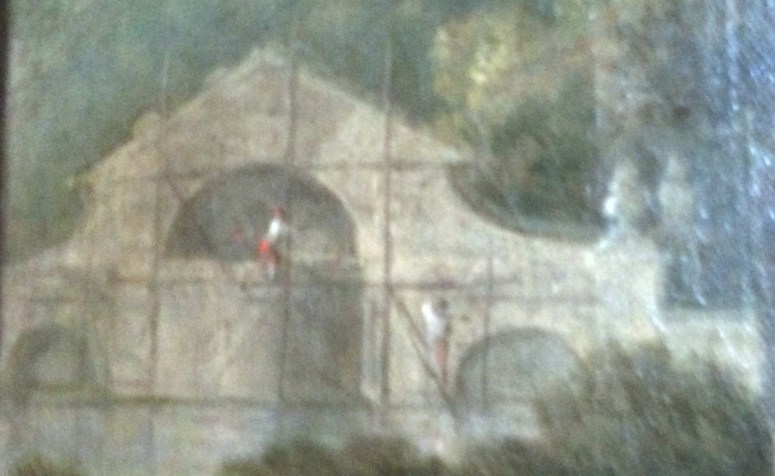 What we had not dared to hope for was new information about the above-ground bridge but new finds kept coming out of the ground in the form of fallen cut stone; much of which is missing from the eighteenth-century structure. At the time of writing there are only two known images of the bridge between 1753 and the 1970’s. This is a detail in a portrait by William Hogarth which was painted two years before the bridge was completed in 1755 and a photograph given to us by Mrs. Gill Durman dated 1950.