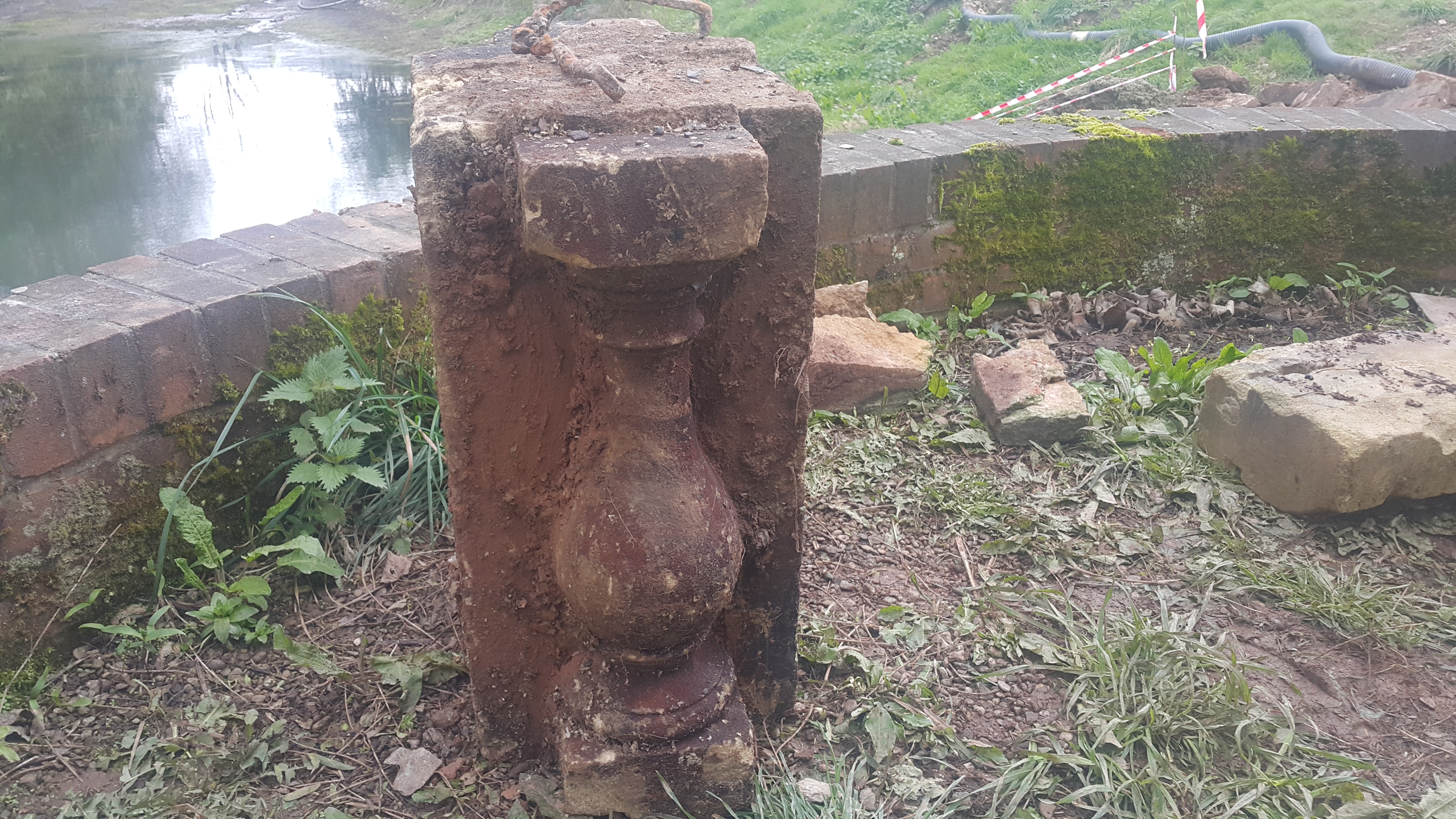 A stone pillar with half-balustrades at either side, found beneath the concrete layer. The red brick wall behind in 1970’s work added to the bridge where this type of stone balustrade was originally sited.