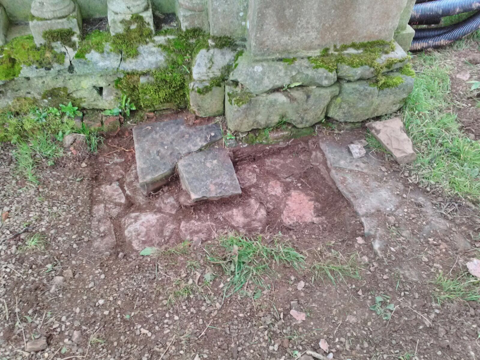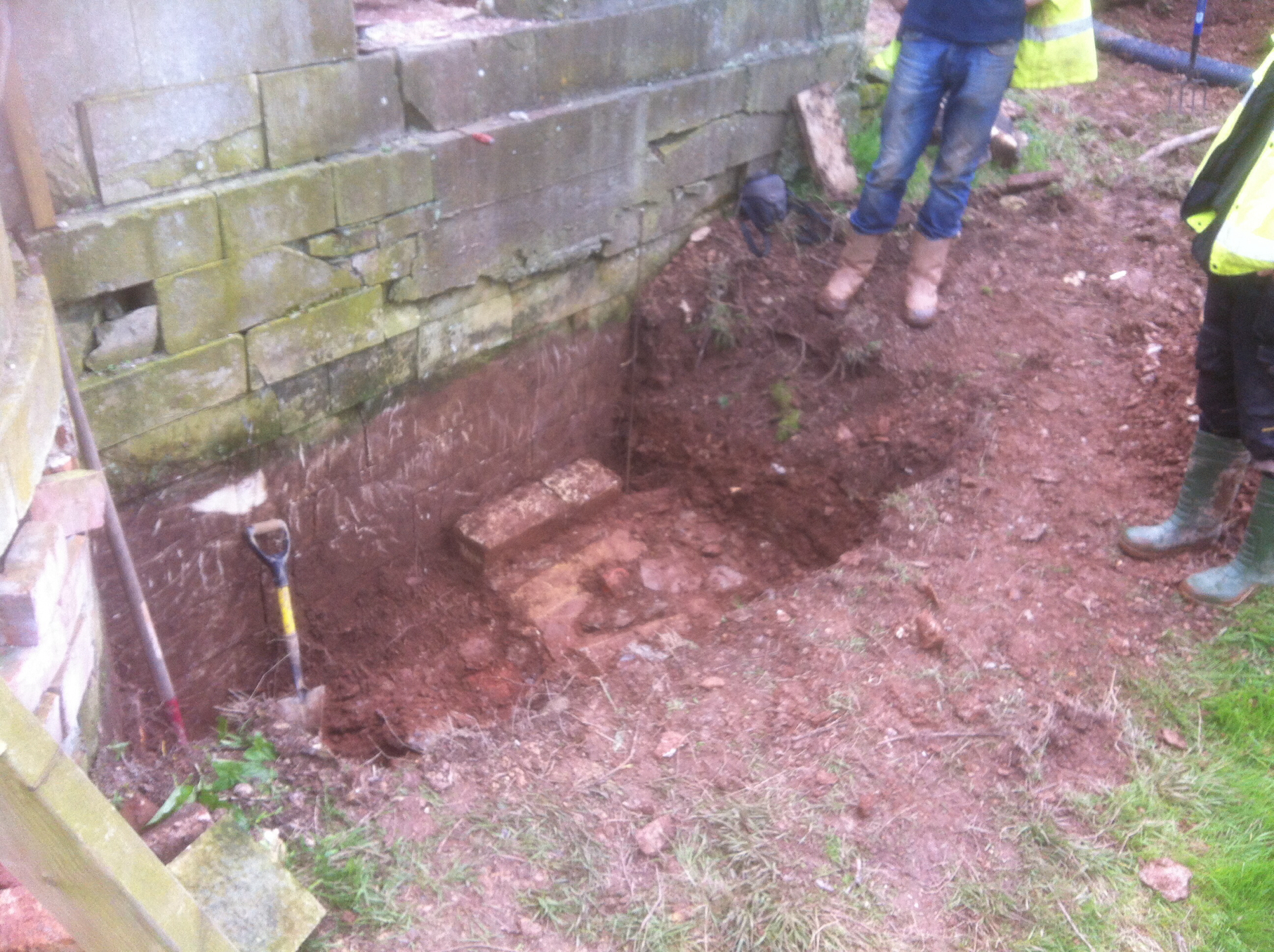 The original pond drainage channel found! The wall section directly above it has been re-built at some point, one of the many historic changes that we have discovered during the first week of exploration works.