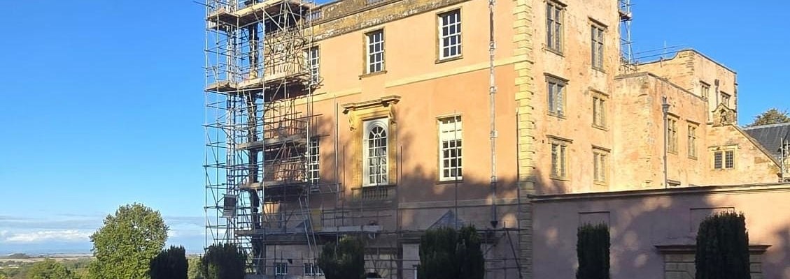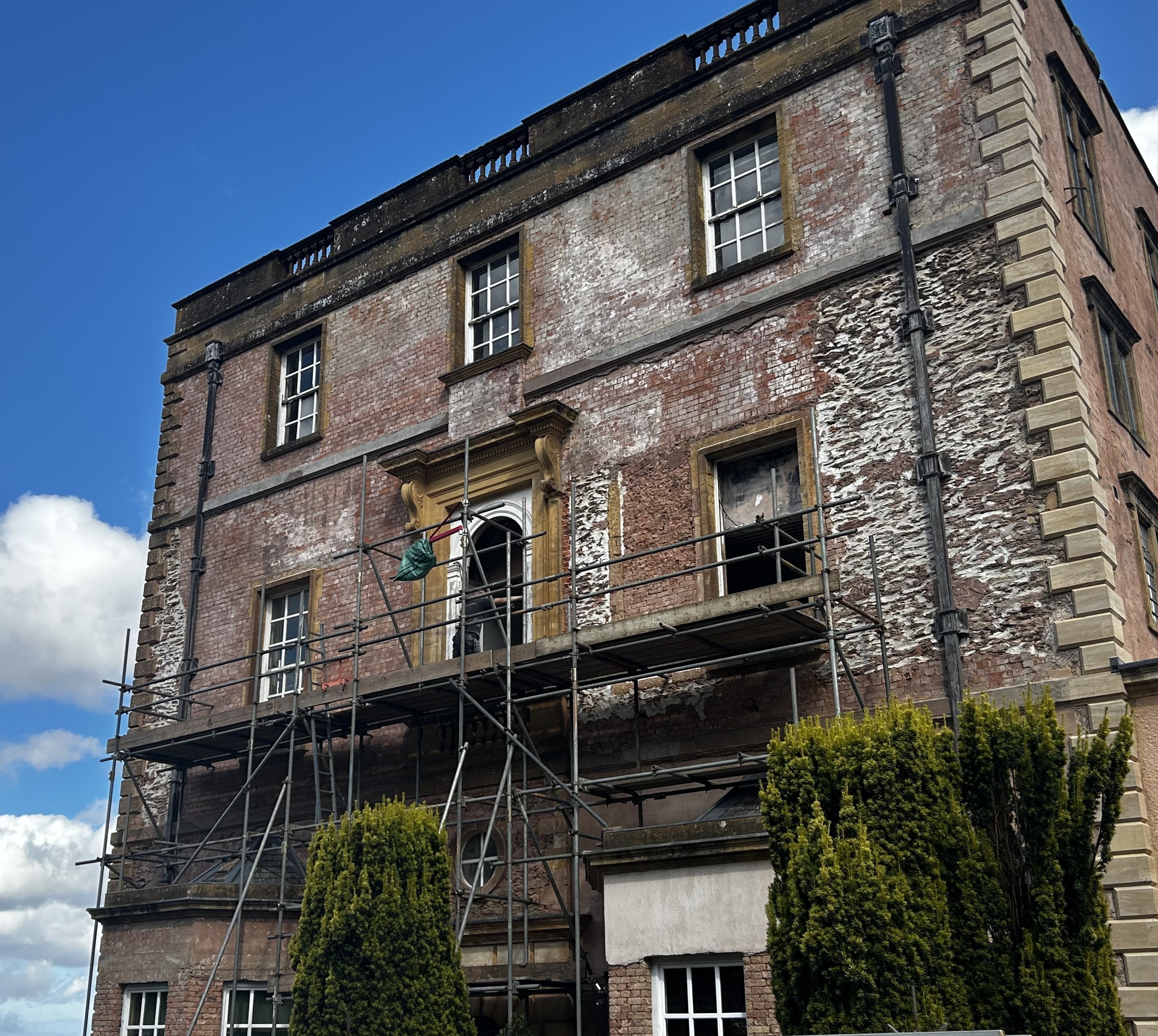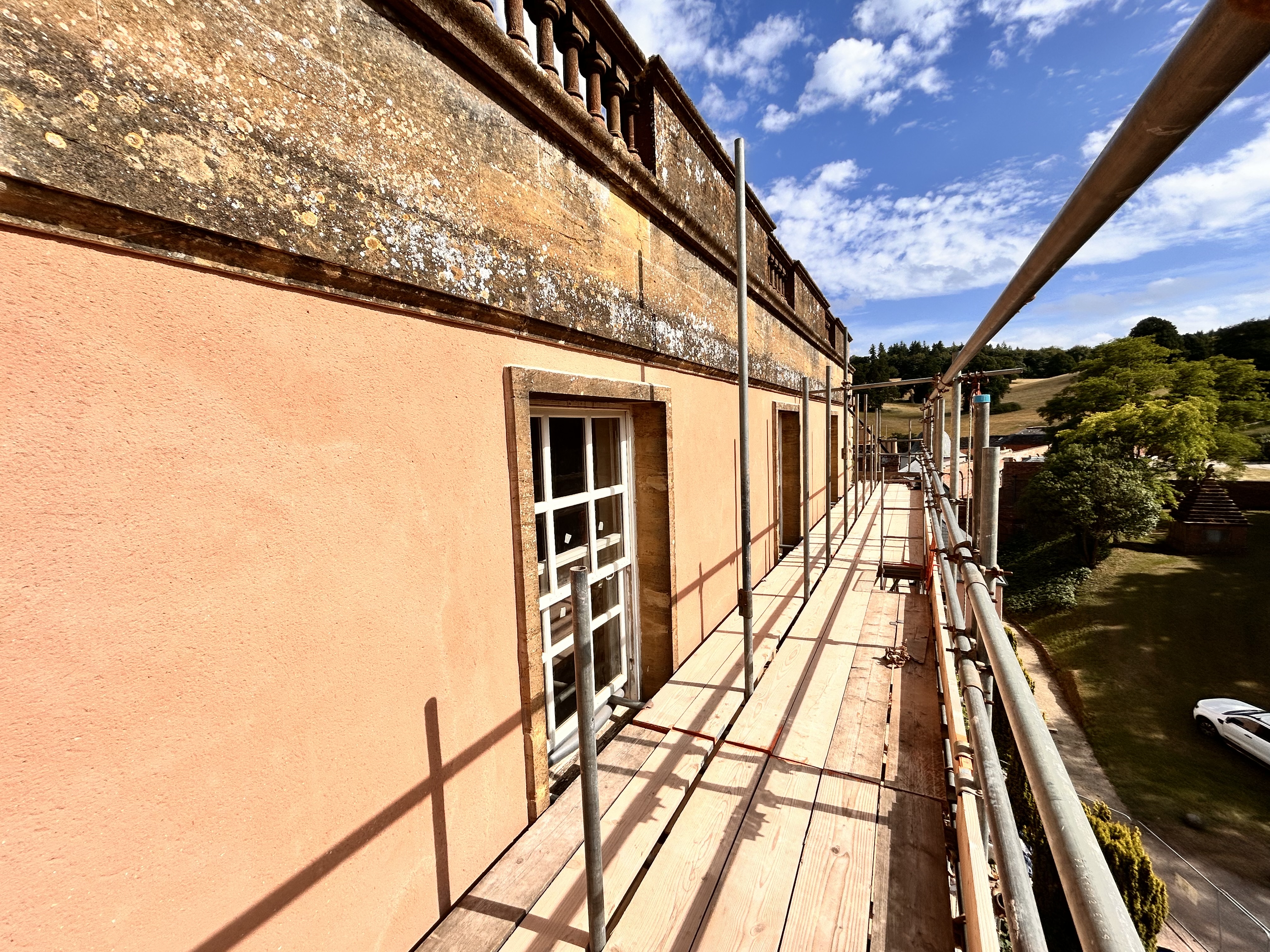 Traditional lime render was needed to correct the problems with modern concrete. This needs to be applied in warm months by skilled traditional craftsmen. Adrian and his team from Twyford Lime expertly mixed and applied the renders, matching the colours of the existing renders elsewhere at Halswell. These colours themselves are based on the red clays in the soil around the estate, traditionally used in its mortars and renders. The finished render is shown here on the top floor, with the render process still in progress to the floor below.