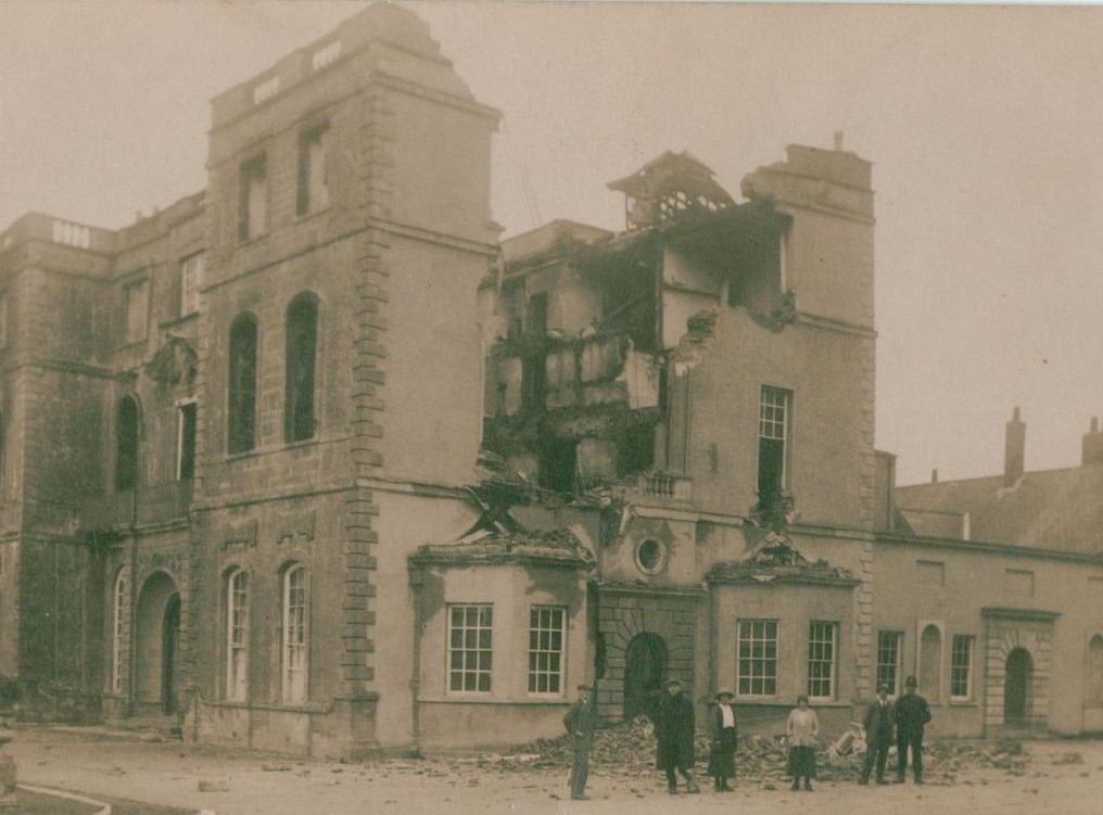 Halswell House in the Edwardian period seems here to have been a tranquil and established pillar of the Somerset countryside community. This summer gathering on the north lawn shows us a house that has stood on this site since Saxon times and, as far as we know, only had good fortune. New parts were added, updated, and it kept up with fashionable architectural and interior developments over the centuries. The west façade was updated in 1753, when its 1680’s baroque carved stone features were removed and a restrained and elegant Palladian façade modelled over the older face. Another, seemingly minor, of those developments was central heating, but it was this that gave the house its first big shock in 1,000 years. In 1923 a boiler in the cellar, directly under the west façade, seems to have caused a massive fire which ripped through that part of the house.