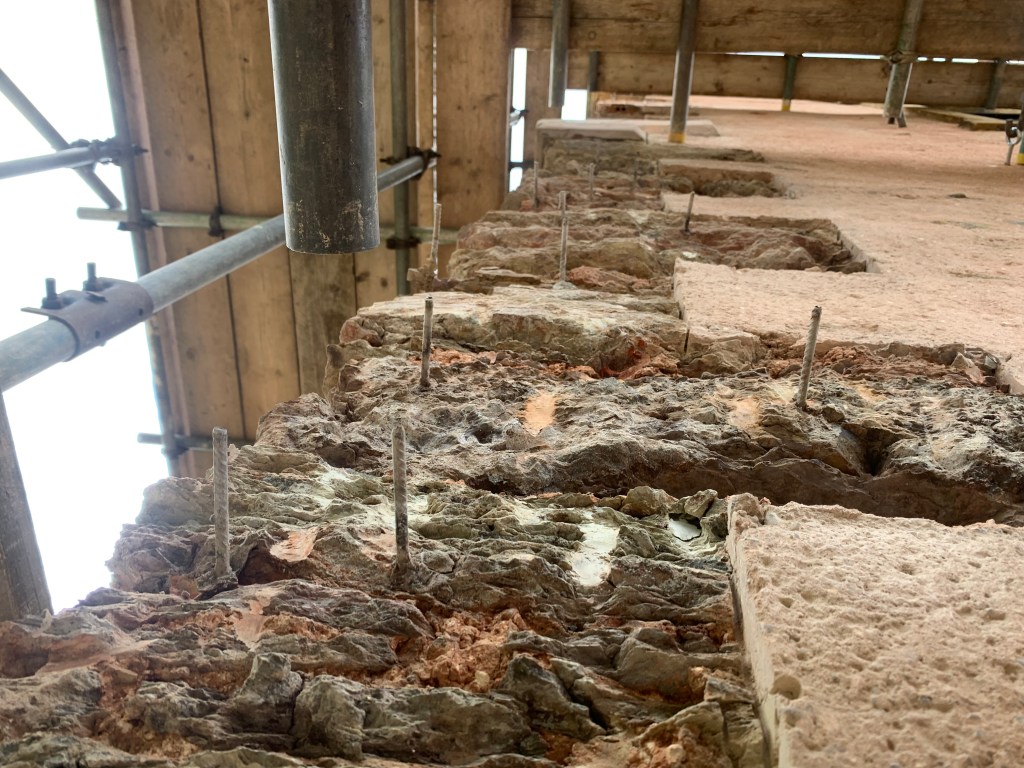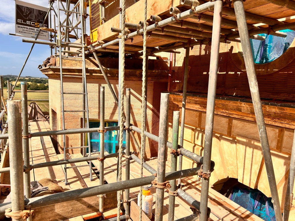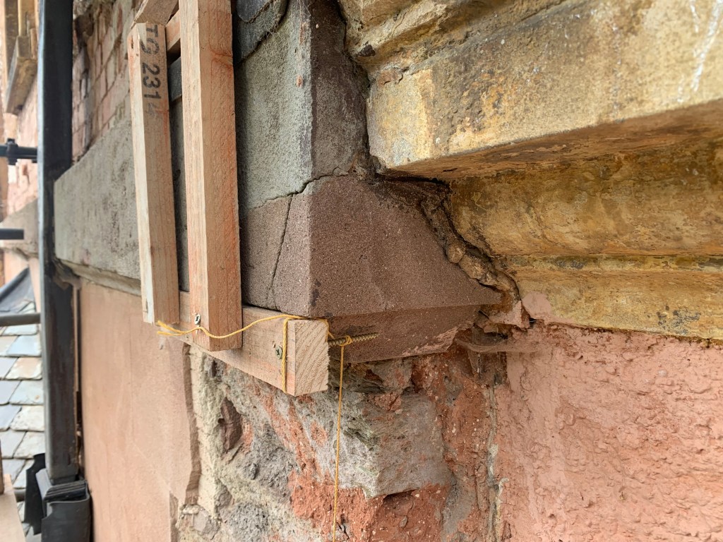 Removing the broken and inappropriate 1920’s and later concrete facings to the west façade. In this image a concrete stringcourse, itself collapsing, is to be be removed and replaced with ham stone, which is the original material used in the 1750’s facelift of that façade.
