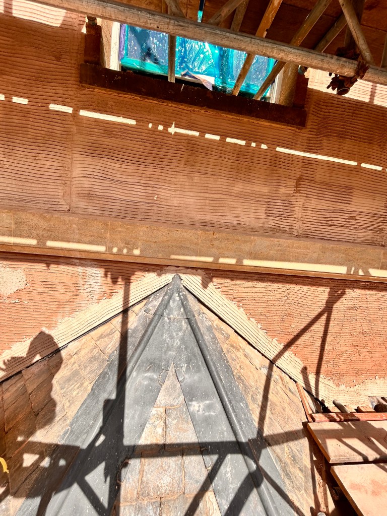 The south-west corner of the house, looking upward, after the removal of the concrete quoin stones which were put onto this area only of the building in the twentieth century. The image shows the old mort slate wall beneath.