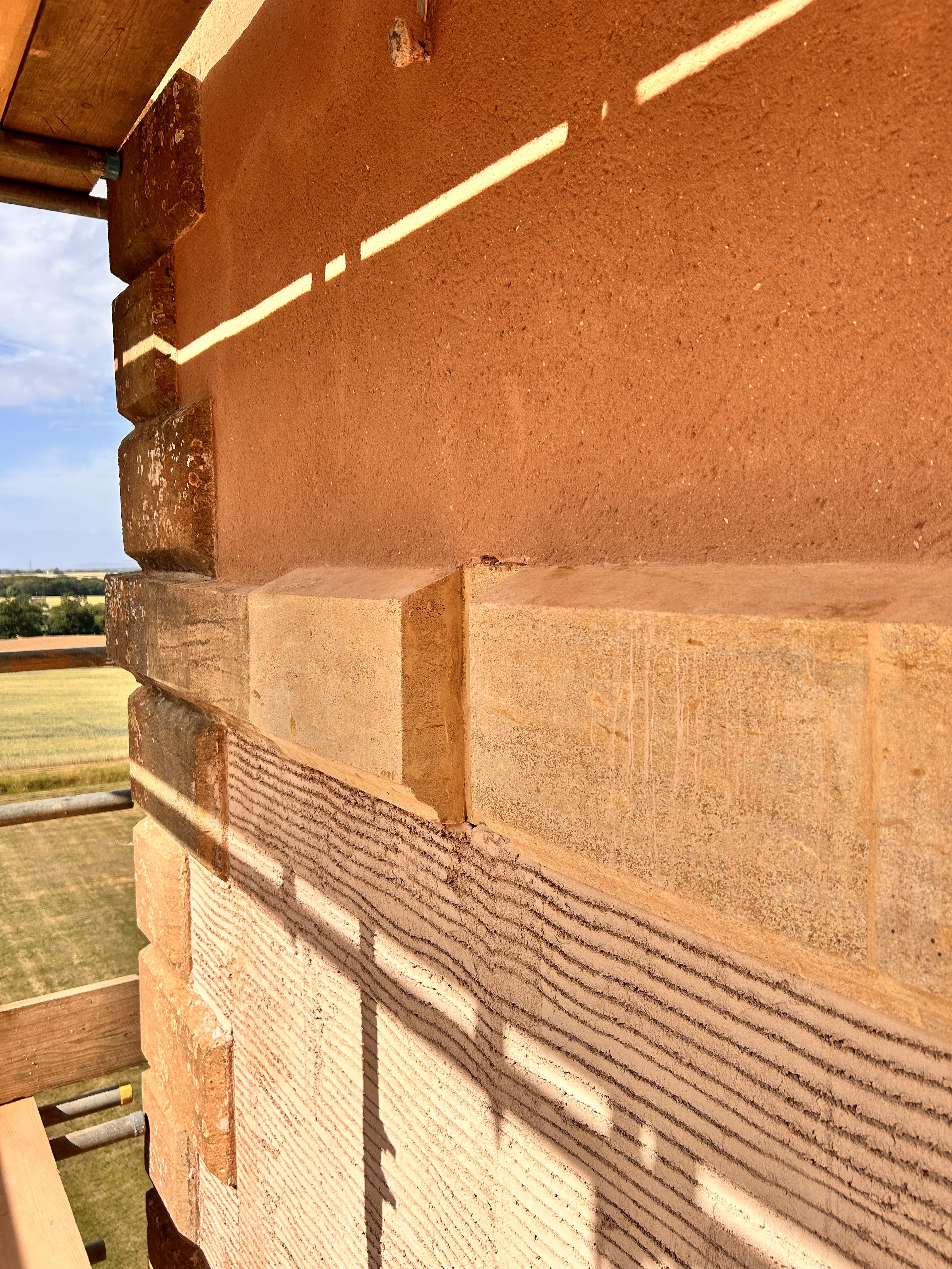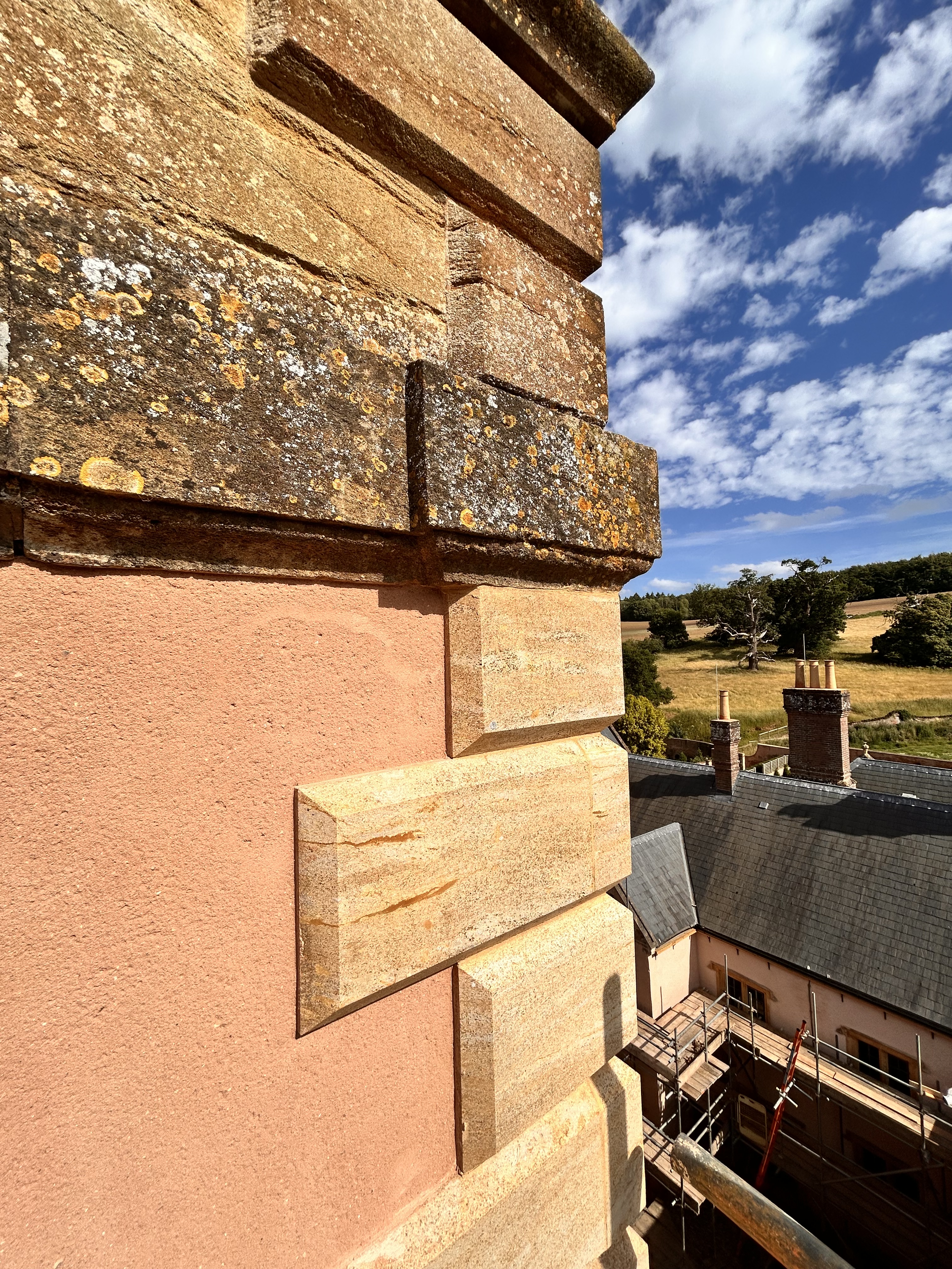 Completed render set against the early ham stone parapet and the new ham stone quoins carved and installed by Orchard Stonemasons.