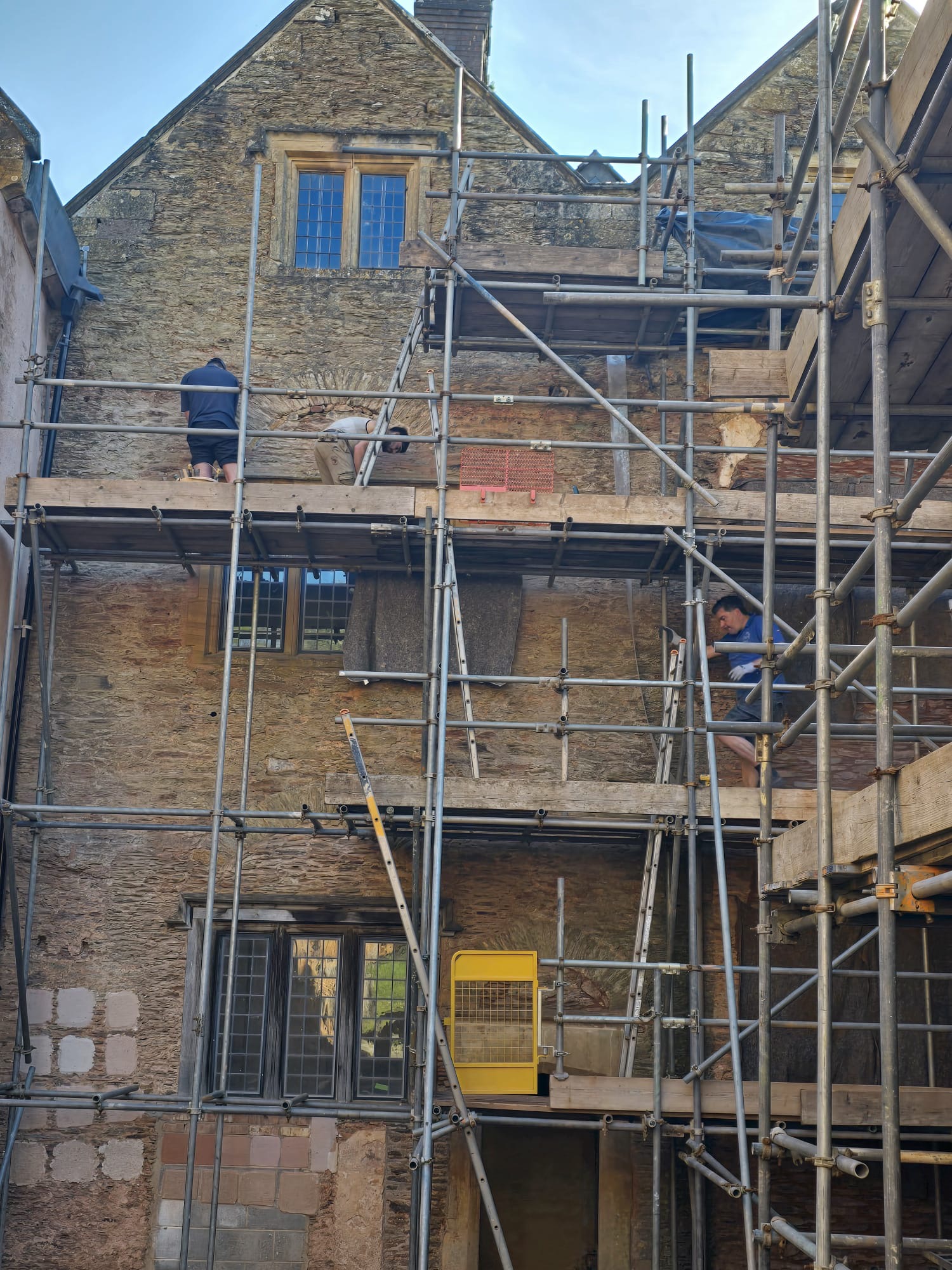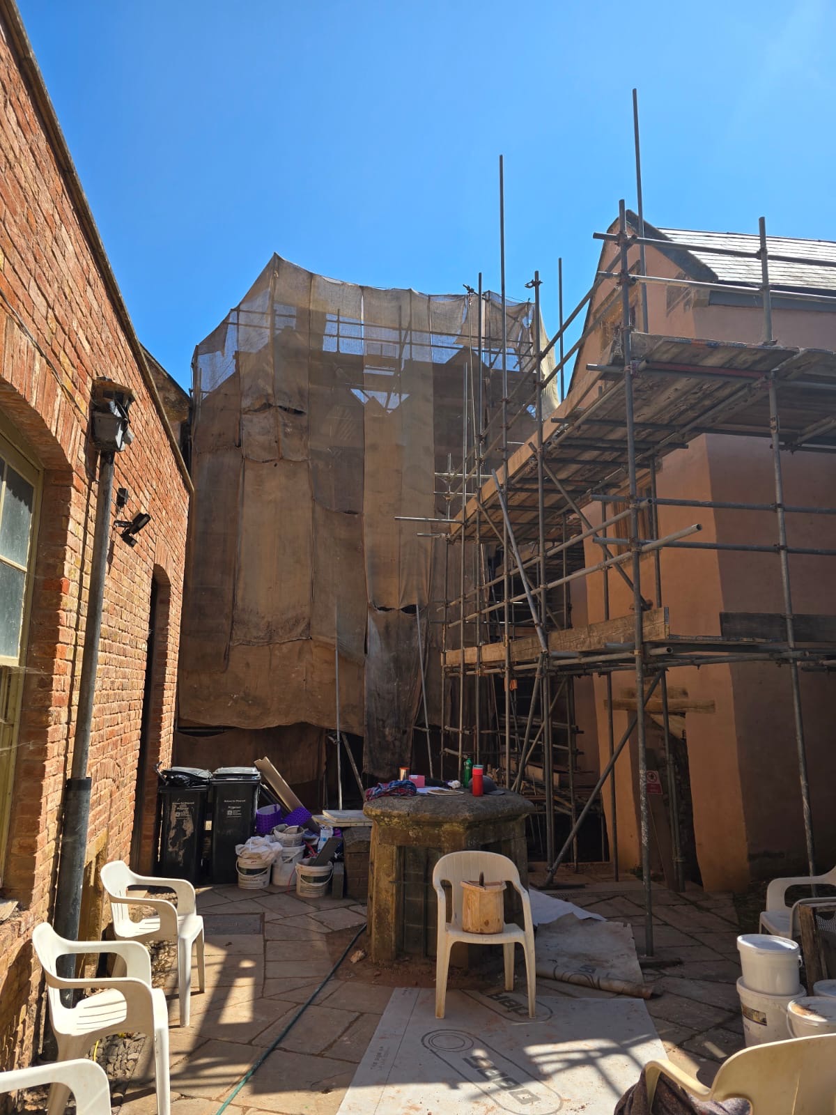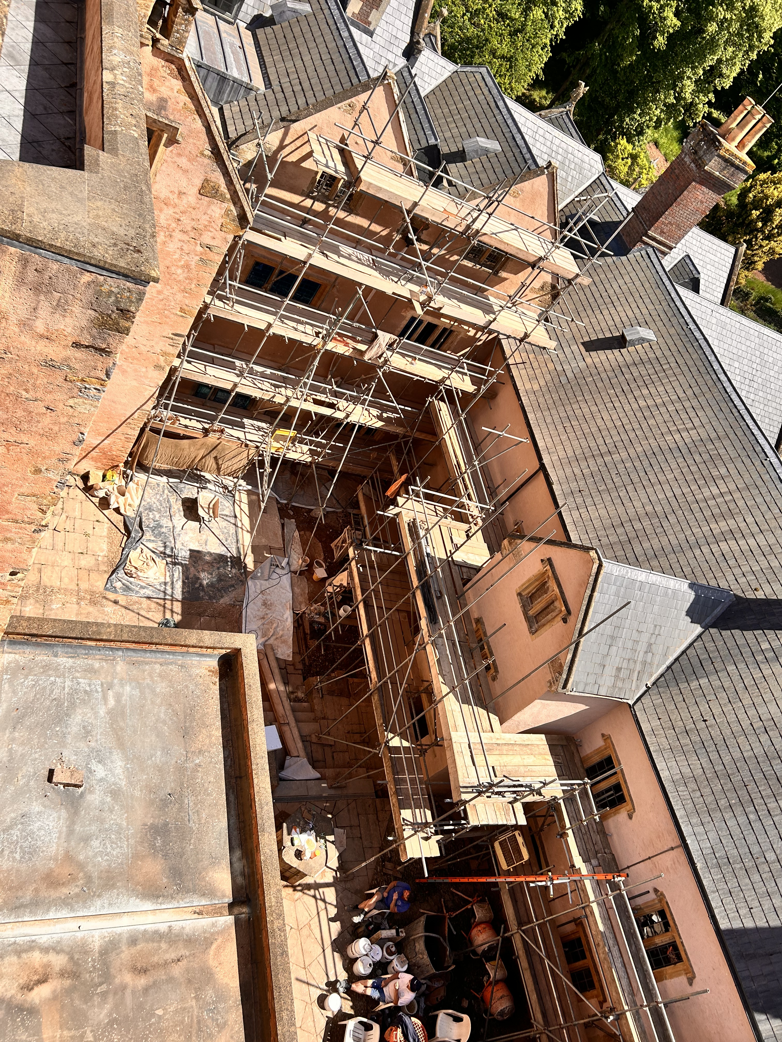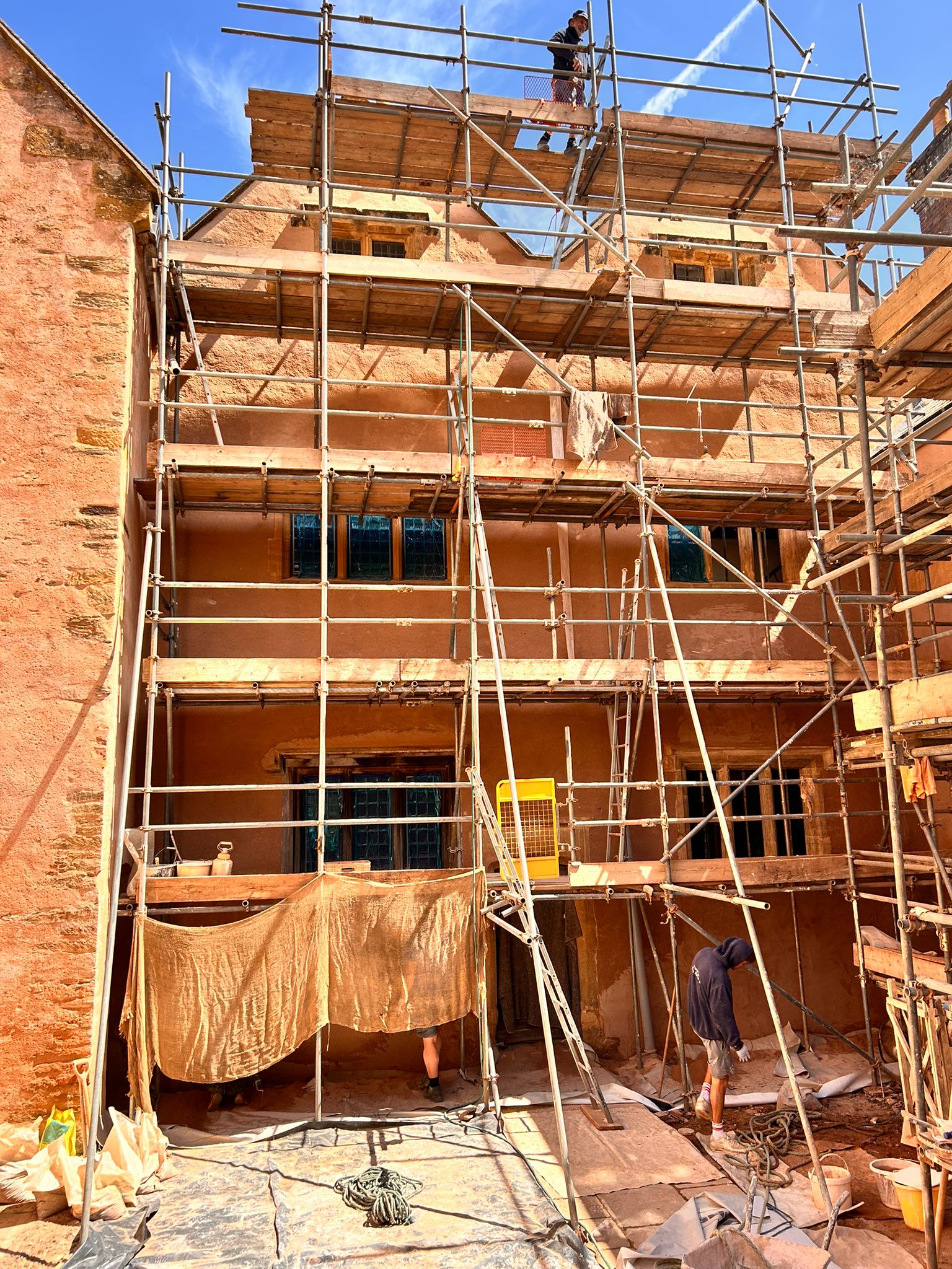 This rendering can only be done in warm months and the large team of lime plasterers from Twyford Lime, as well as the stone masons, and lead work artisans lead by Ben Bruce, meant the courtyard was a hive of activity and break-times in the hot summer months of 2025. With the gauze up to allow the render to dry slowly in the sun, the expectation for the ‘grand reveal’ became all the more intense.