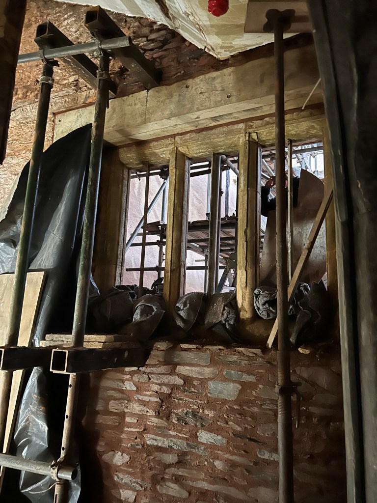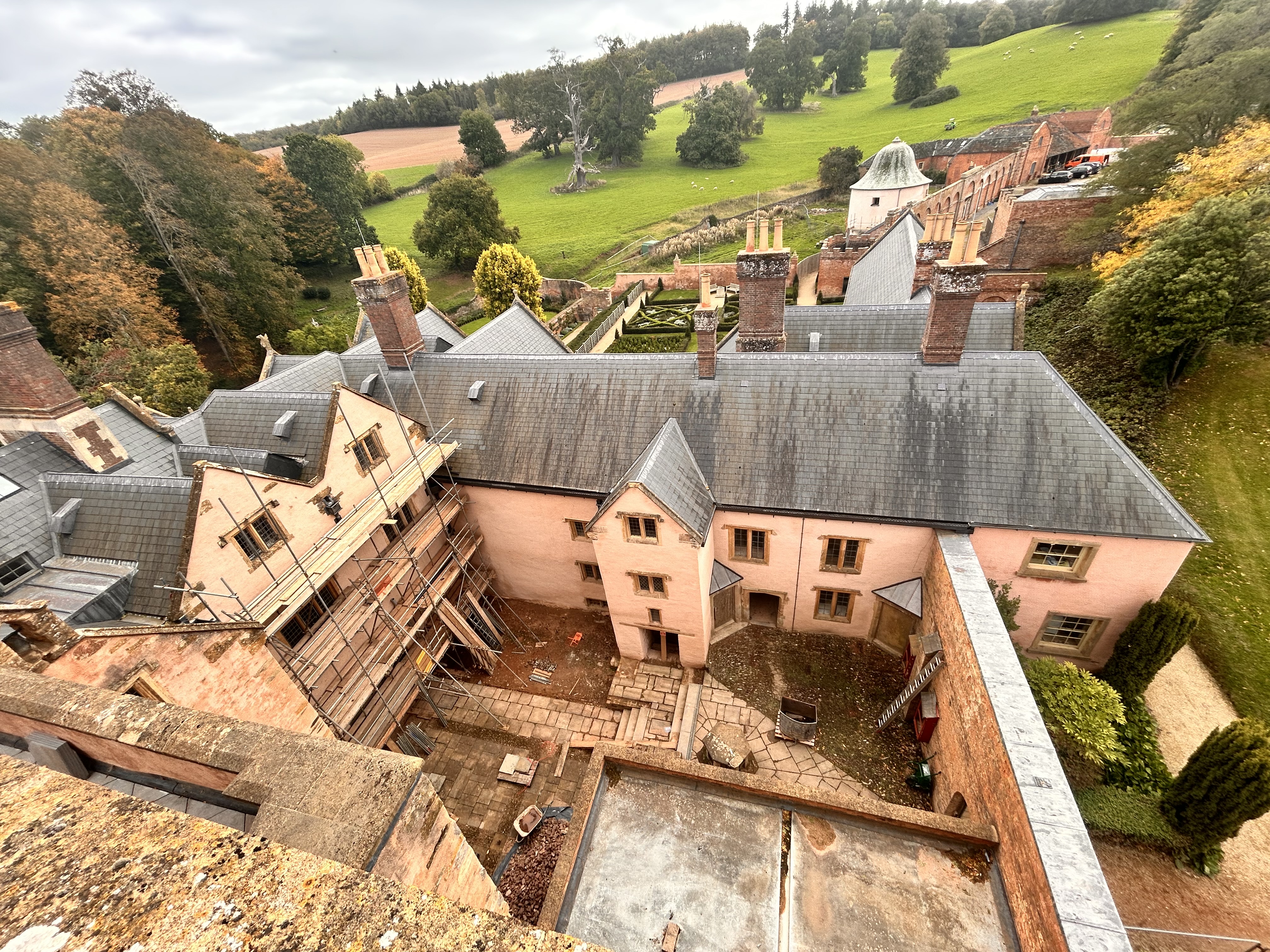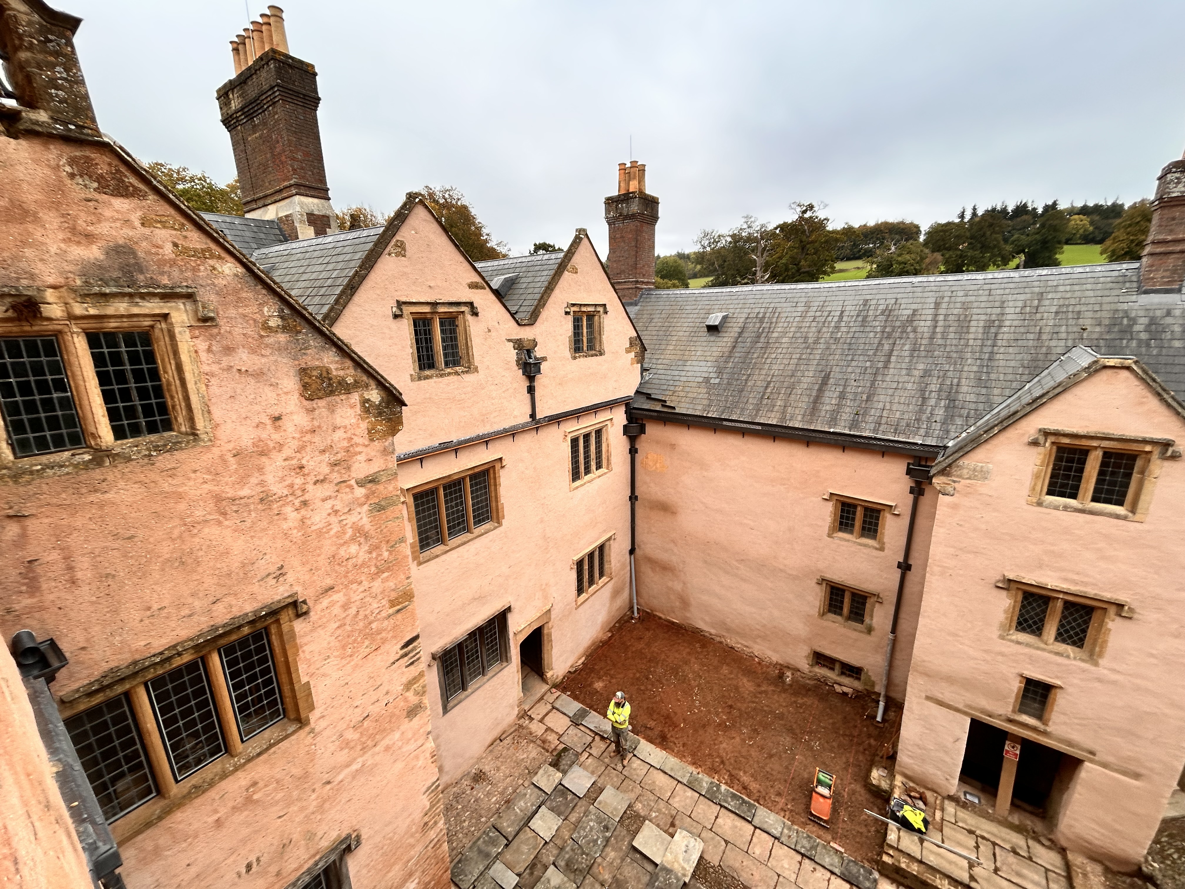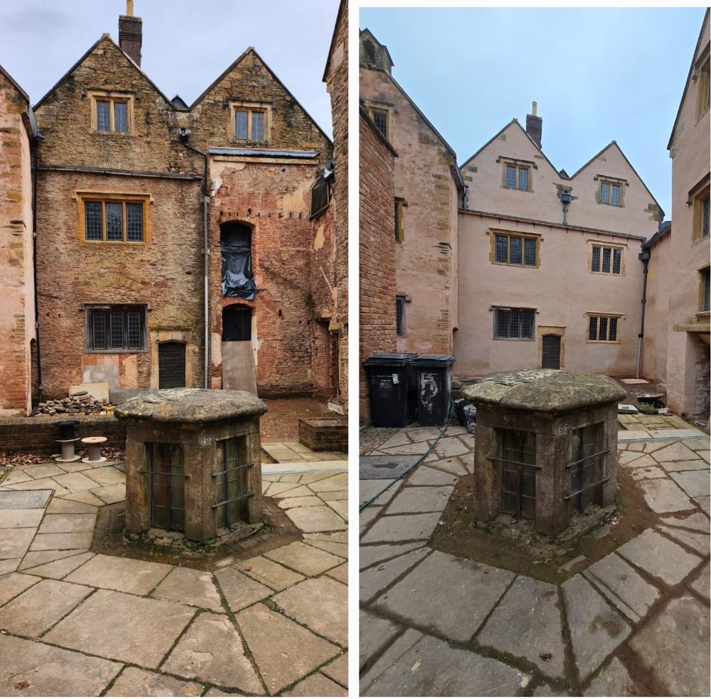 This rendering can only be done in warm months and the large team of lime plasterers from Twyford Lime, as well as the stone masons, and lead work artisans lead by Ben Bruce, meant the courtyard was a hive of activity and break-times in the hot summer months of 2025. With the gauze up to allow the render to dry slowly in the sun, the expectation for the ‘grand reveal’ became all the more intense.