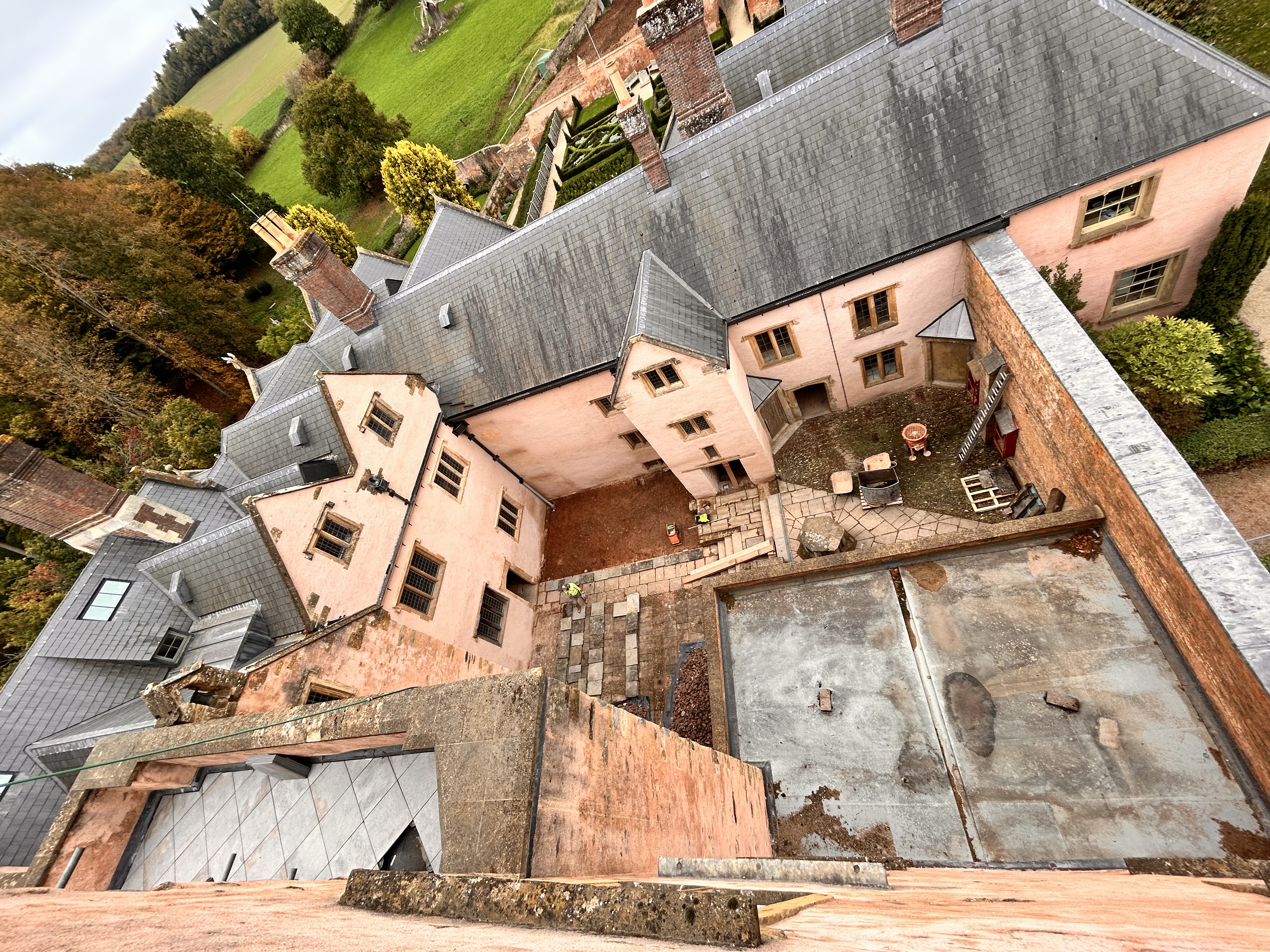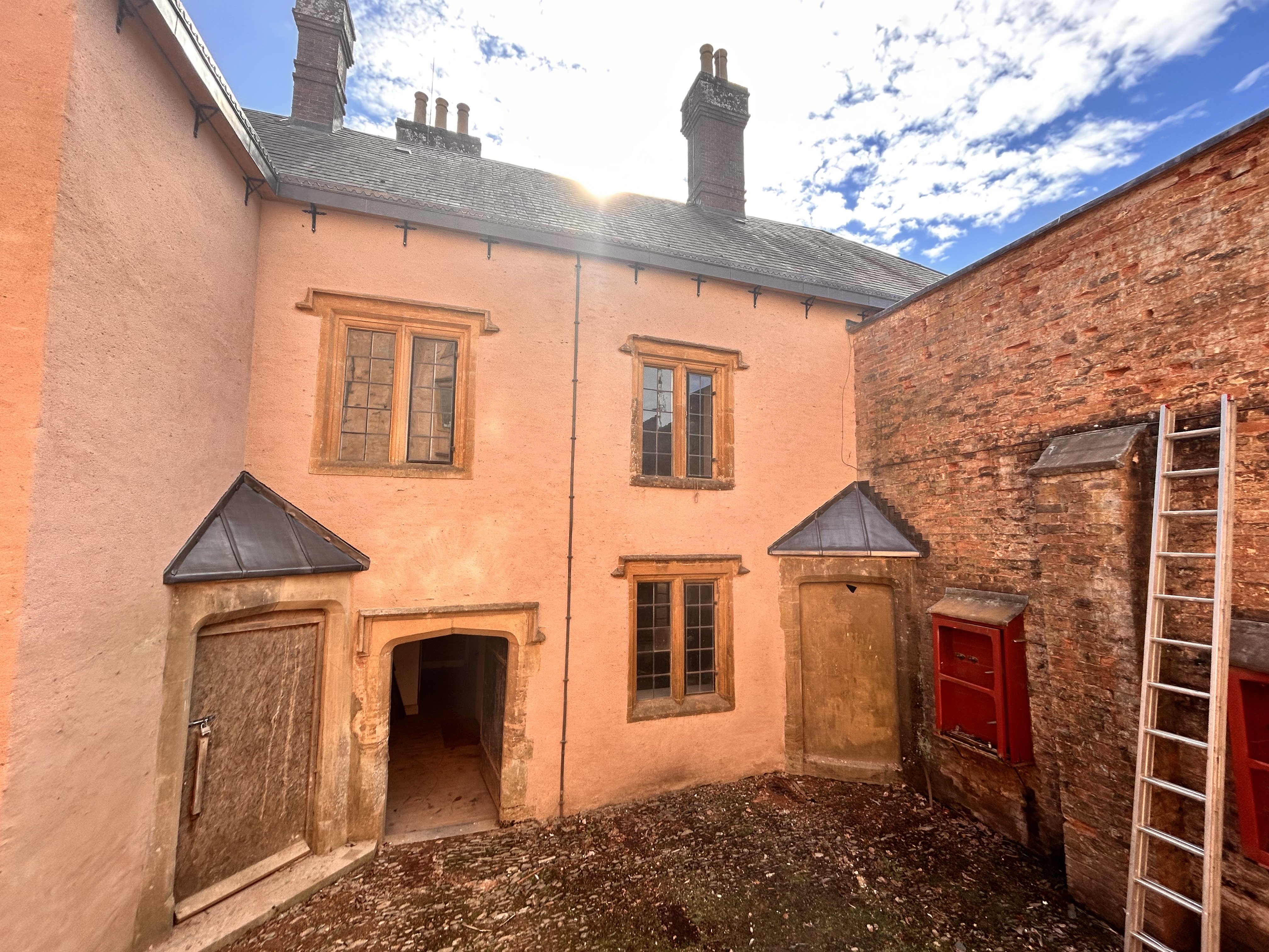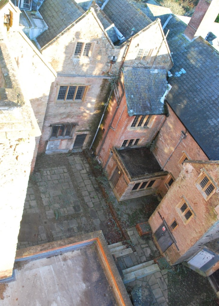 While the courtyard still, for now at least, currently retains one later flat-roofed addition, seen here, the damaging other late additions are no longer causing such dramatic problems with the historic fabric.