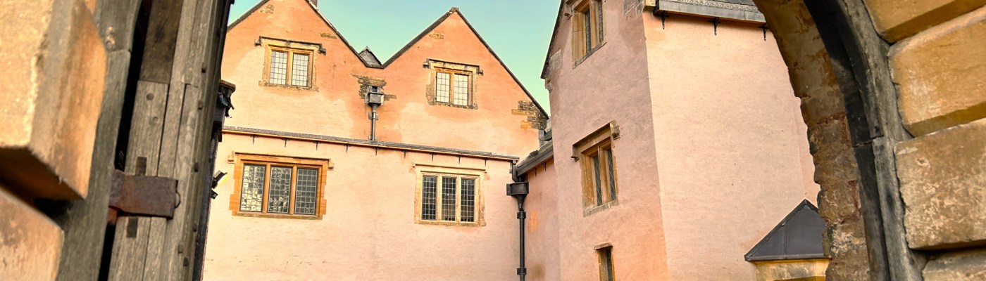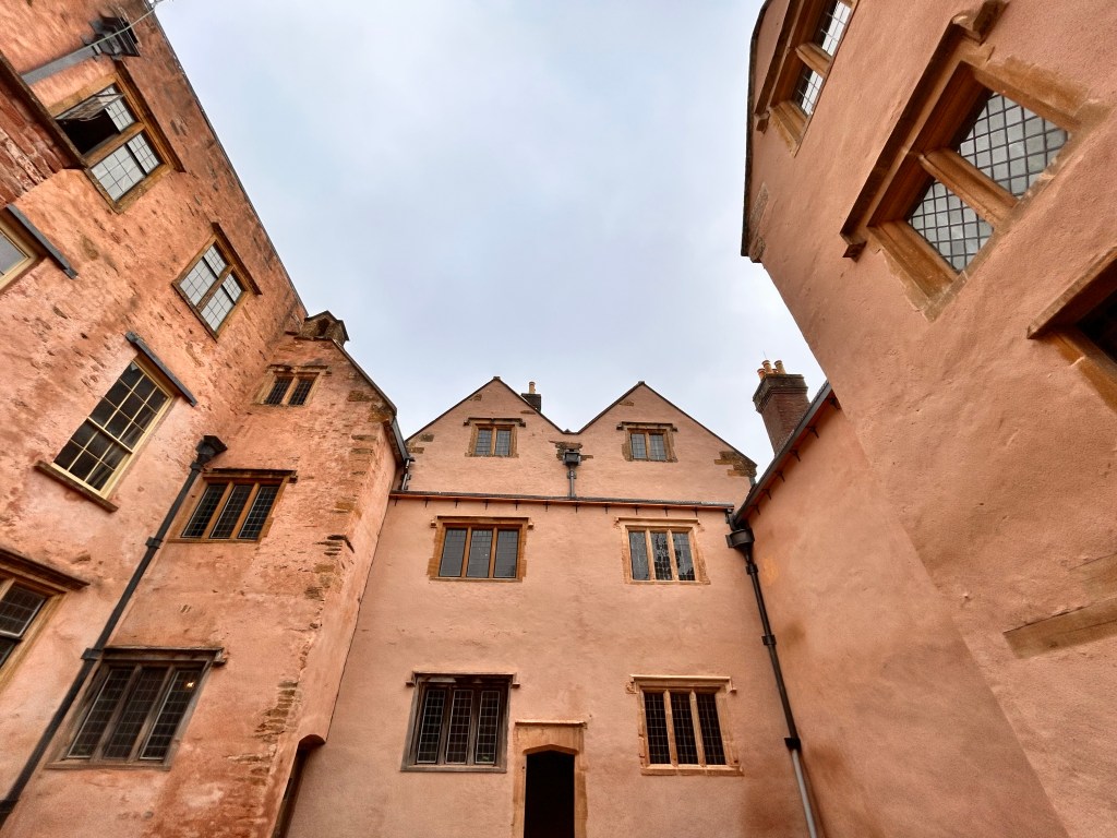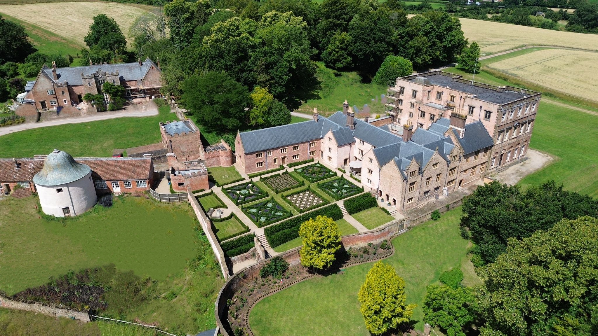 In this image the courtyard can partly be seen between the large Baroque north wing and the more rambling south and east ranges which appear more classically Elizabethan. To the south of this is the Tudor knot garden which served the house in the Elizabethan period. Despite the north wing having some of the country’s earliest wooden sash windows to the east, north and west façades, the south façade of the Mansion House retains its earlier stone mullion windows with small leaded lights, in keeping with the older looking courtyard.