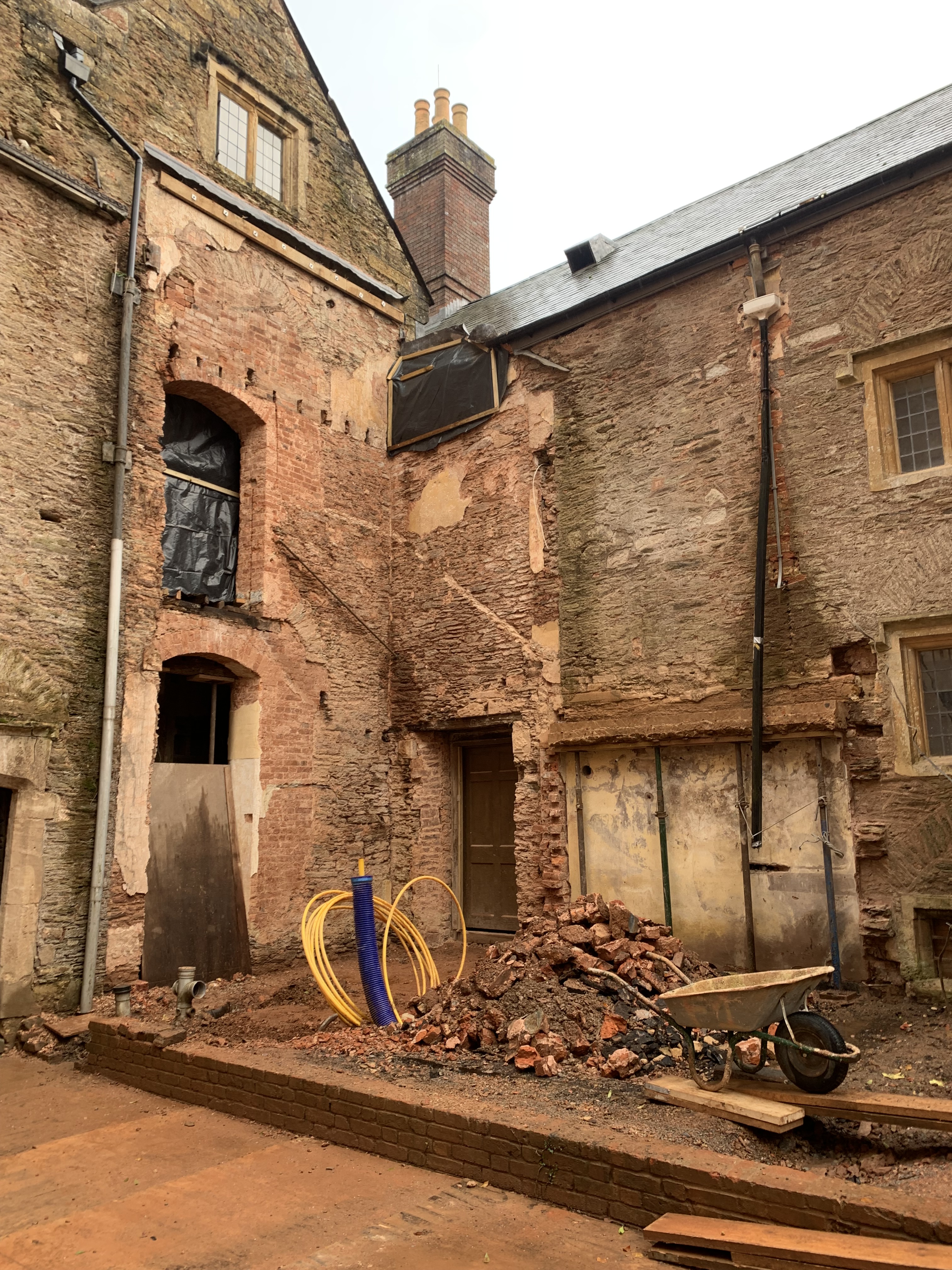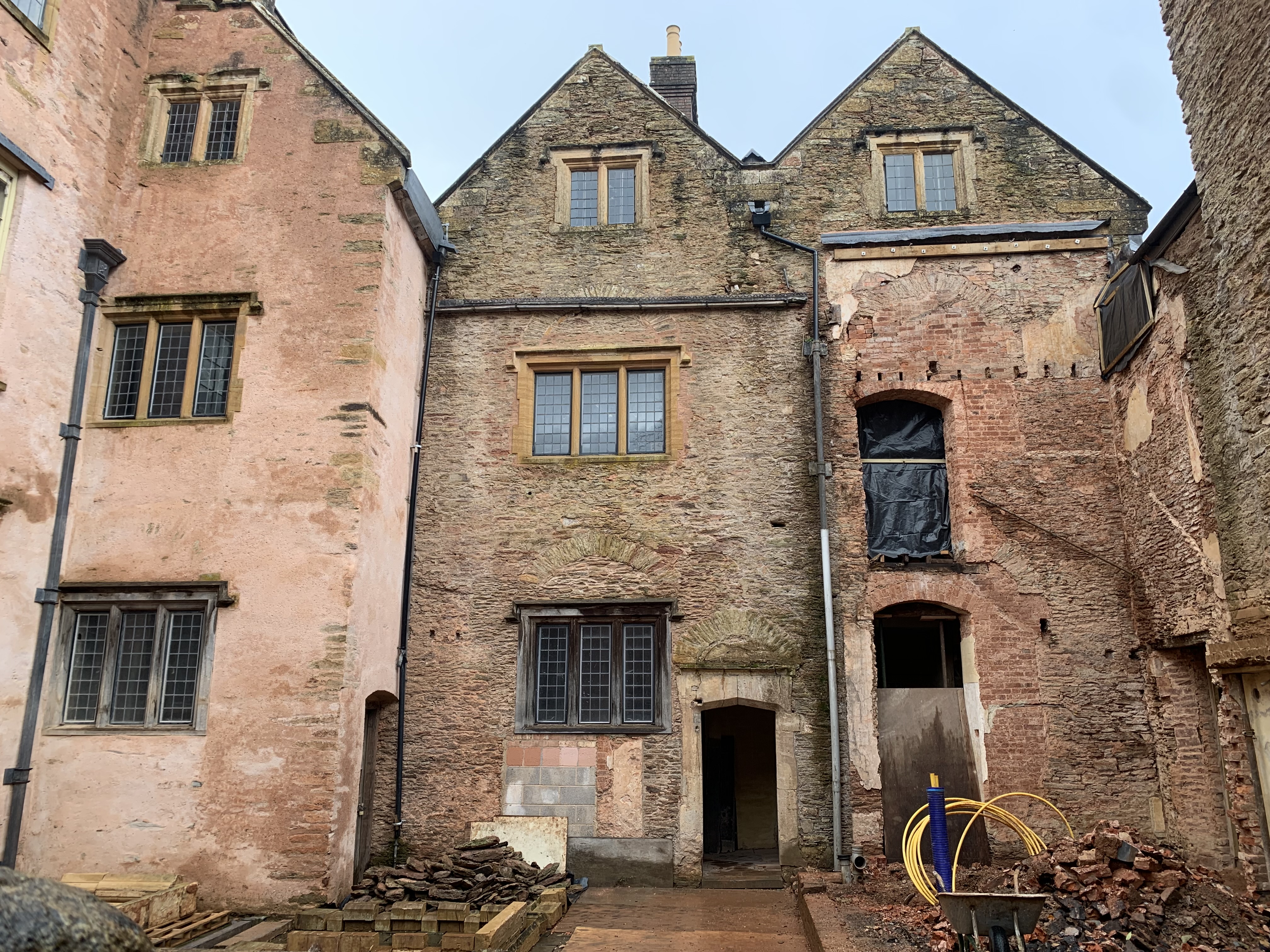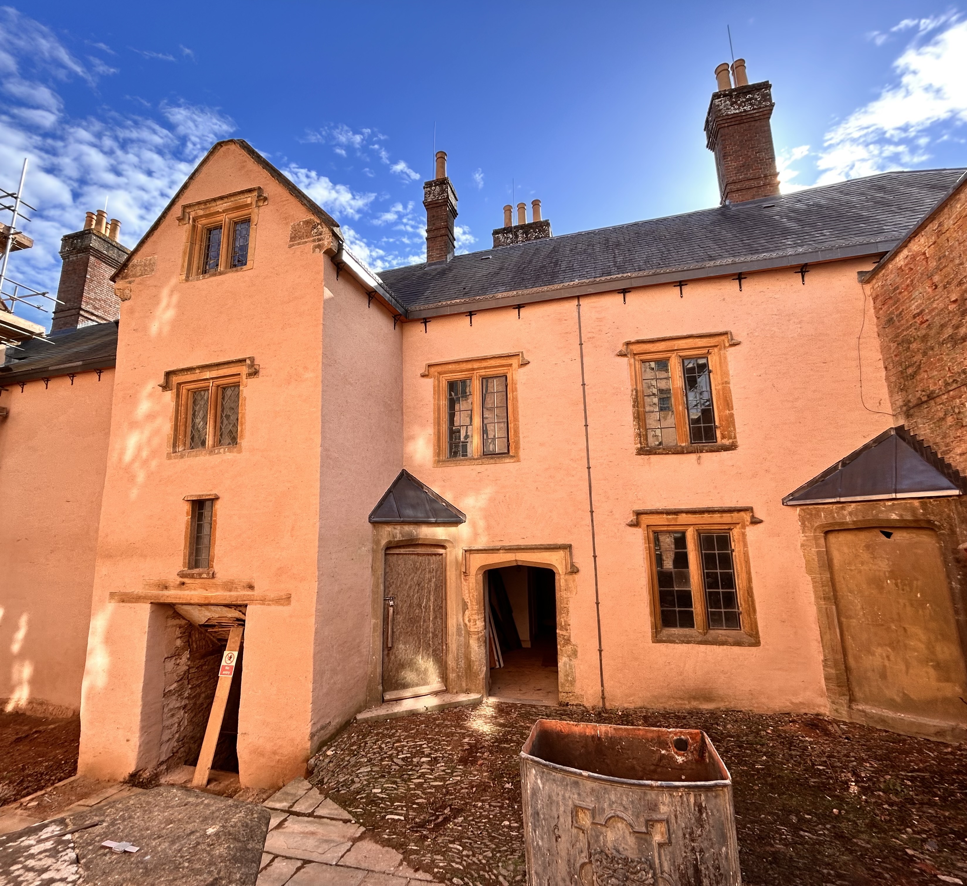 By carefully removing and retaining all the materials that came out of the later additions we were able to ascertain that two of the stone mullion windows that were placed in the later red brick stair tower were in fact the original Elizabethan windows from the morte slate façade. With a combined team of our in-house builders and the specialist stone masons from Devon Stonemasons we rebuilt the original morte slate walls that had been damaged with later red brick inclusions. The old central courtyard door had cracks and structural impairments repaired and the original windows were laid out for later re-insertion into their first home – the courtyard façade wall itself.