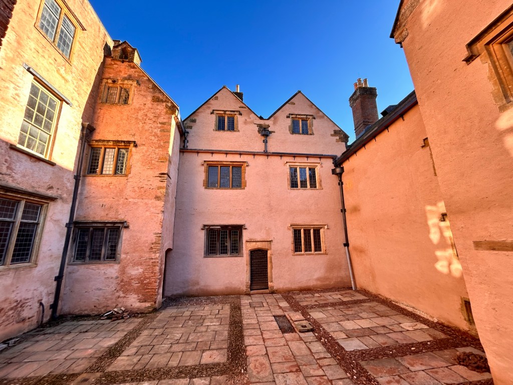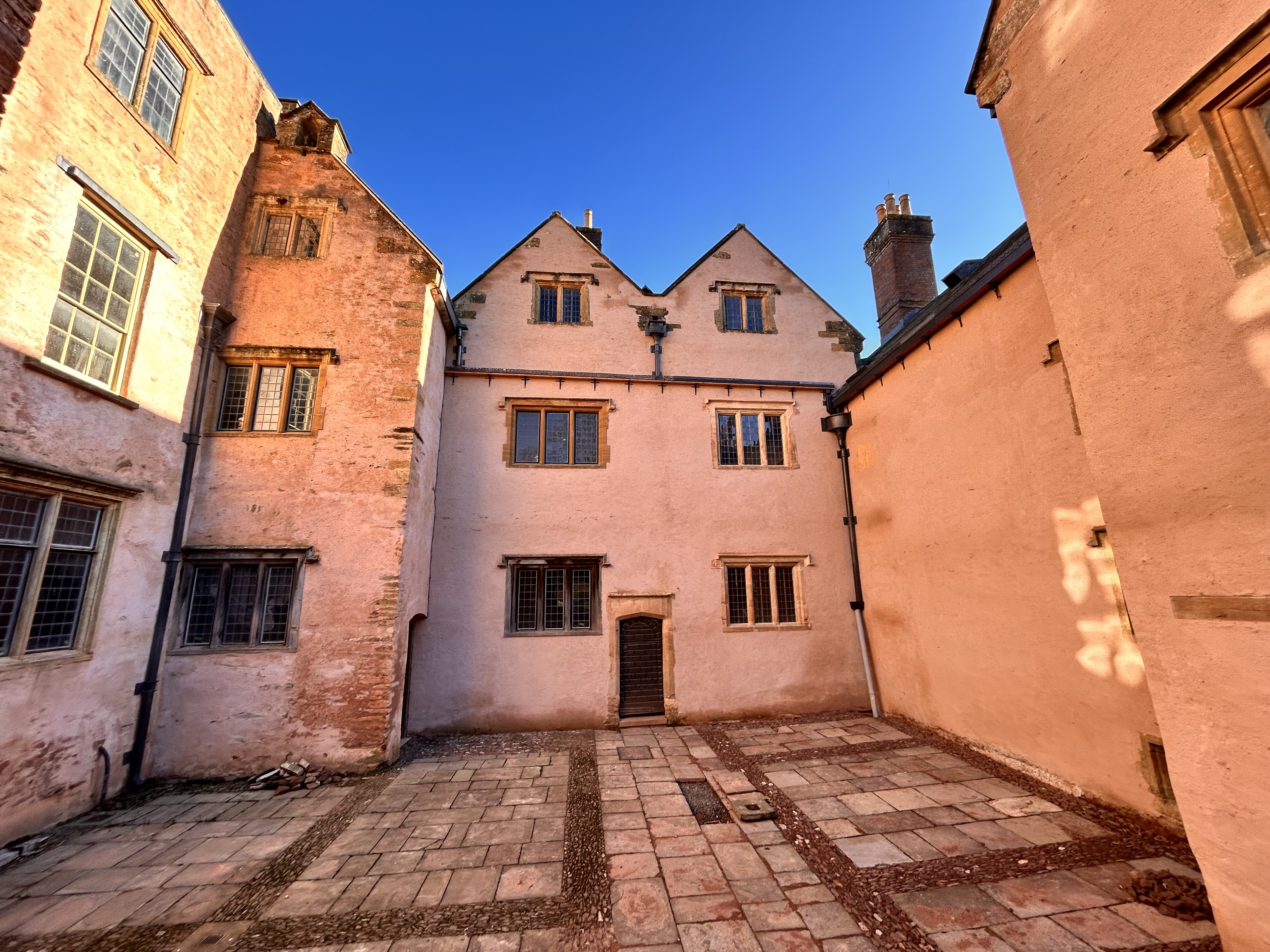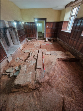 We know that a much earlier Hall house, now no longer visible above ground, existed within the courtyard from where the current ‘Justice Room’ exists at the south of the Mansion House, and this extended into the area that is now the courtyard. Its original north window wall, shown here as a masonry line in the middle of the room, was discovered of this earlier Hall while carrying out archaeology. The current courtyard is on the other side of the mullion windows at the right of this photo.