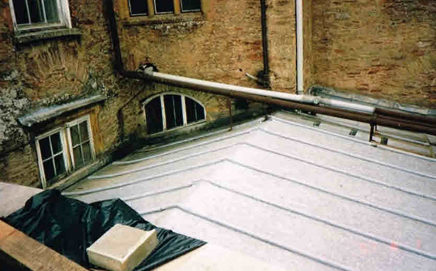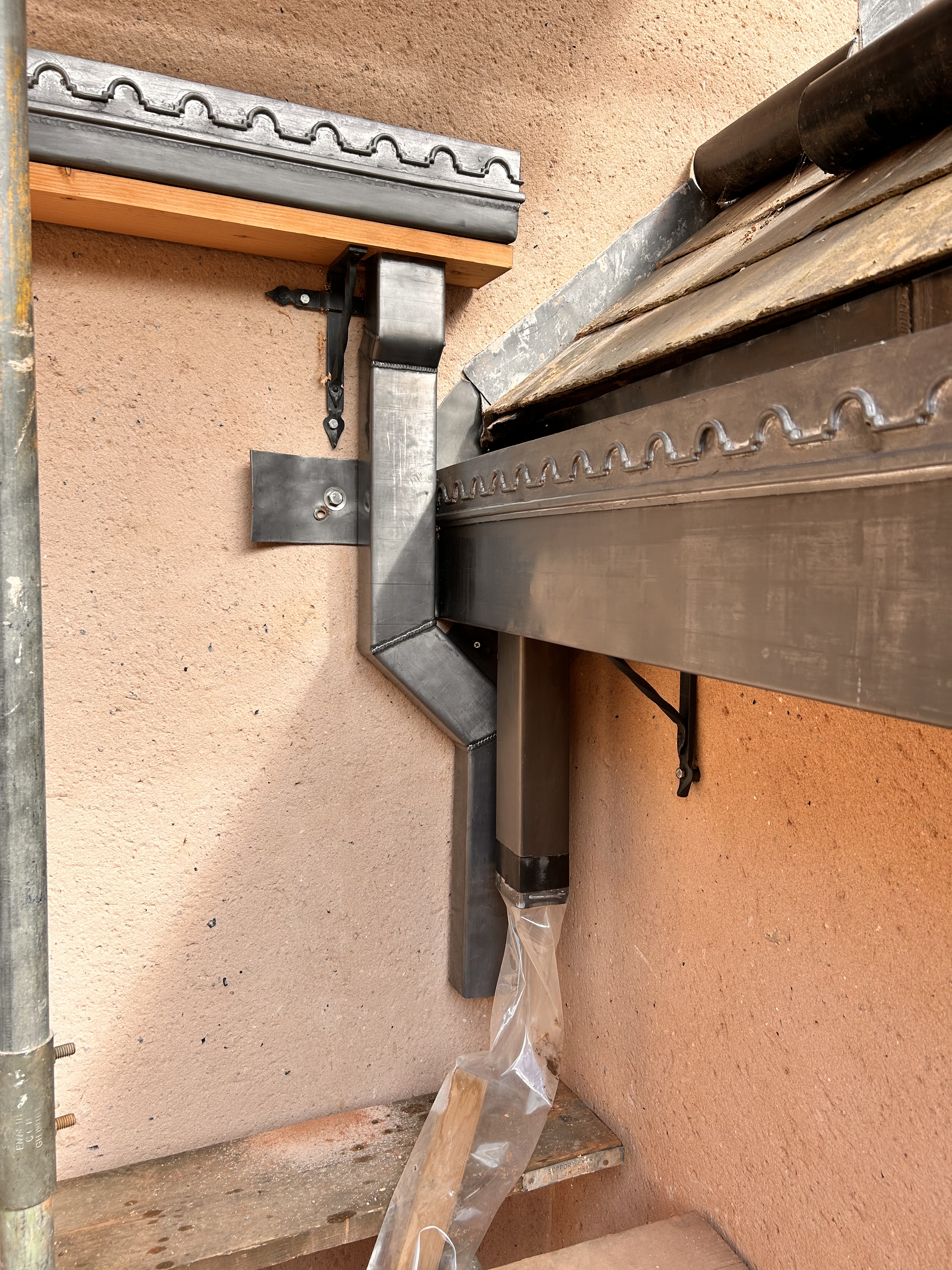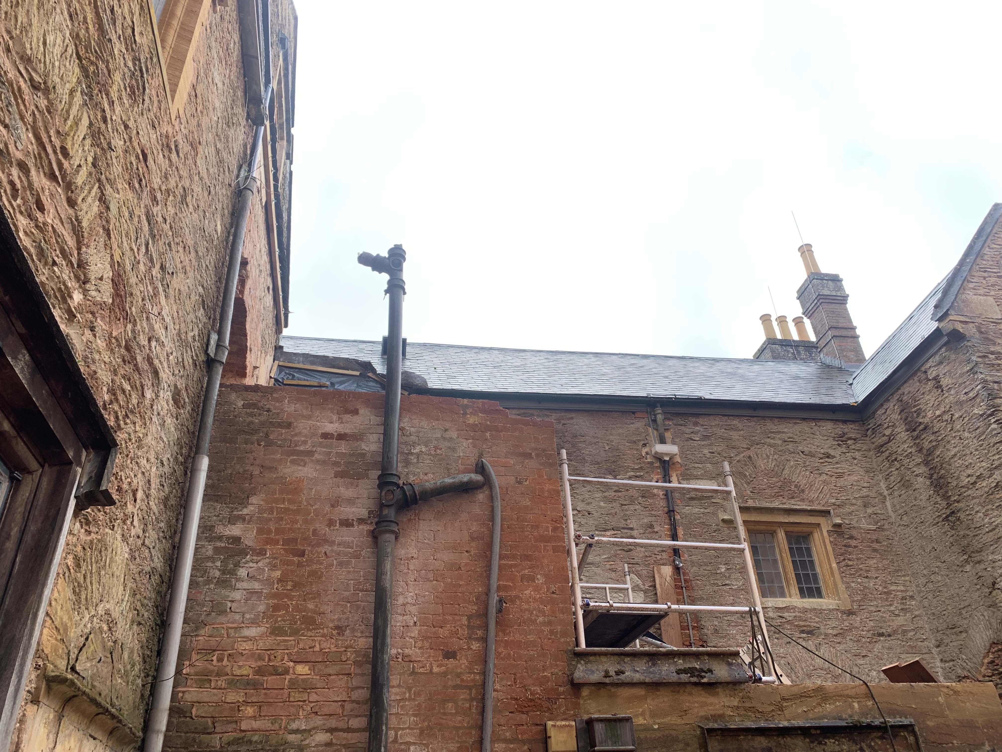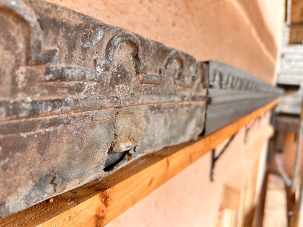 We had one long early piece of decorated leadwork, pictured above. We recreated the courtyard leadwork based on this original piece of guttering, as seen here. It is very important that all new additions to the historic building are clearly of their date.