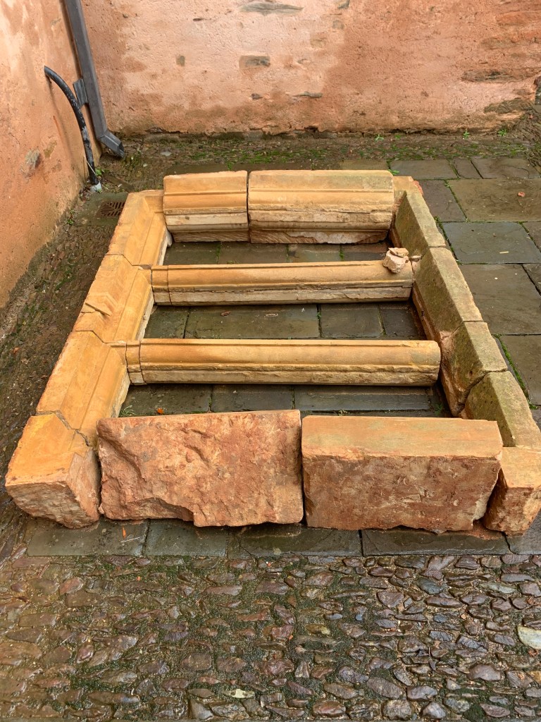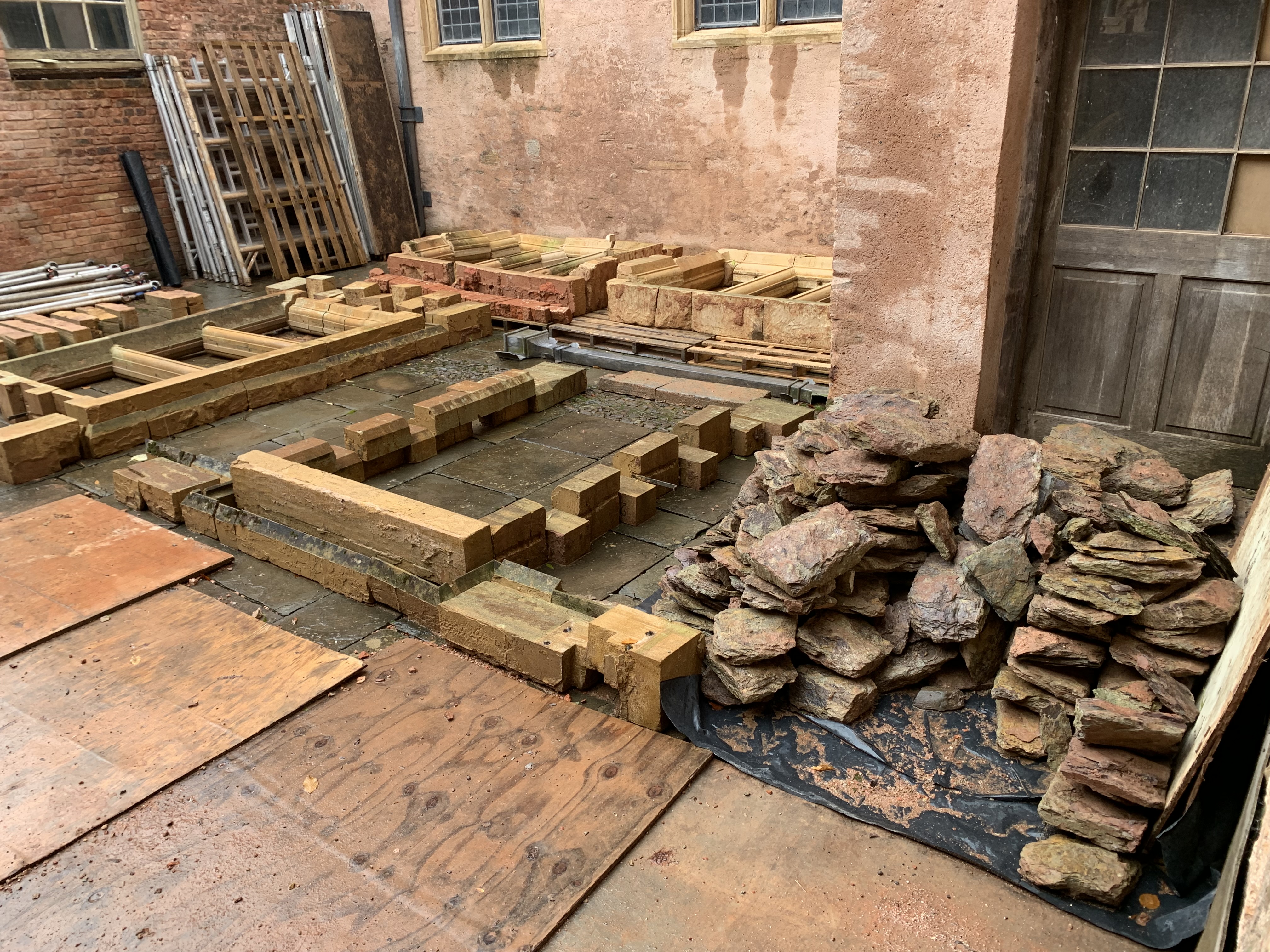 The lead cistern of 1713, in the foreground above, has now also been restored and will be put into place within the courtyard. No longer required for water management, for which is has been redundant for over 100 years, the important Halswell family cistern will be used decoratively within the new courtyard garden design.