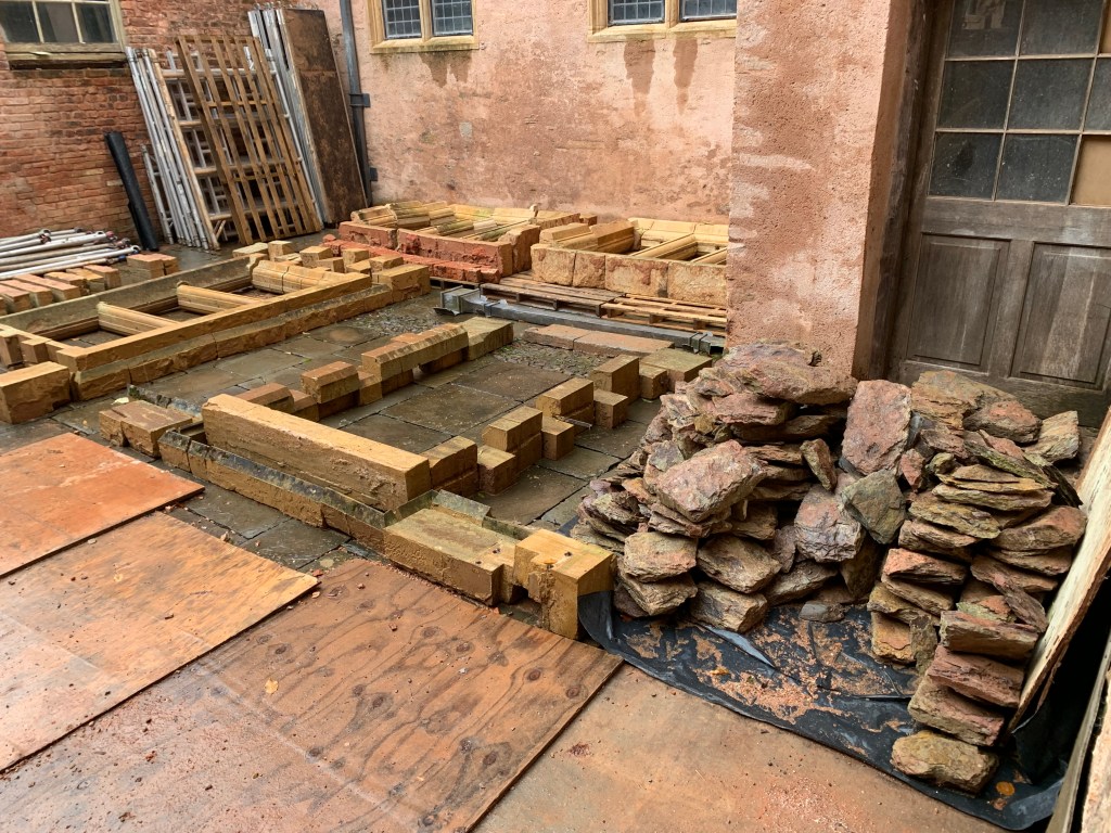 New cobblestone and blue lias flagstones being laid out to complete the flooring of the courtyard.