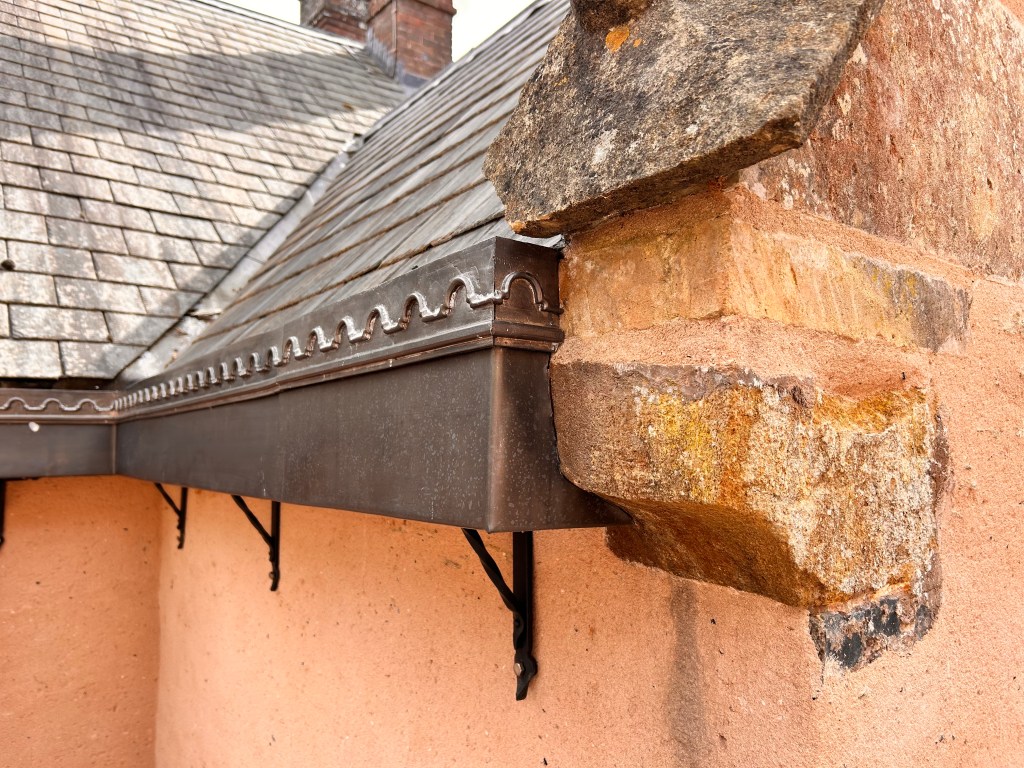 Part of the leadwork was also topping the two stone roofs of the corner doors. They have beautiful cut stone triangular tops but unfortunately that was never water-tight enough and the subsequent damage over hundreds of years meant we needed to upgrade this design and add lead tops to the doors, while retaining the cut stone beneath. The heavy lead gutters above are held up with traditional hand crafted iron brackets from our blacksmith Kevin Chedzoy.