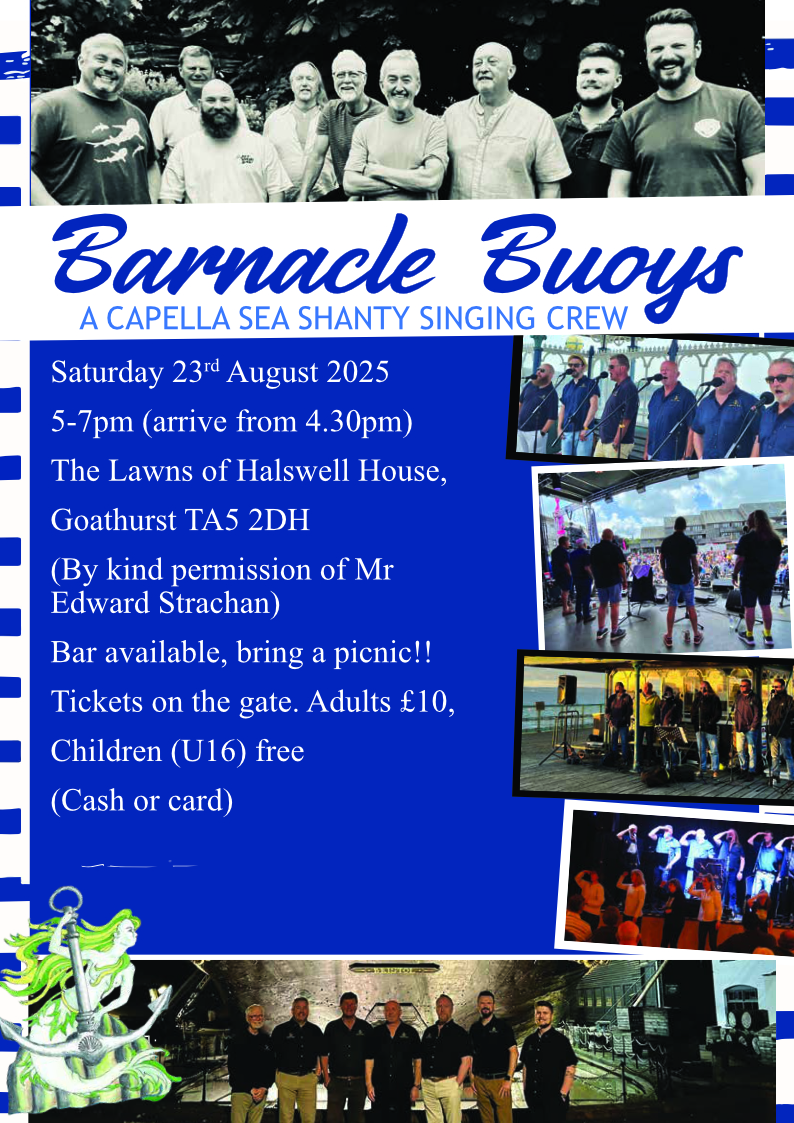 Saturday 23rd August 2025, 5-7pm (arrive from 4.30pm) on the lawn at Halswell. Bar available, bring a picnic. Tickets on the gate, adults £10, accompanied children (U16) free! Parking along the drive. All proceeds raised to local charities, St Edward’s Church and Goathurst Village Hall.